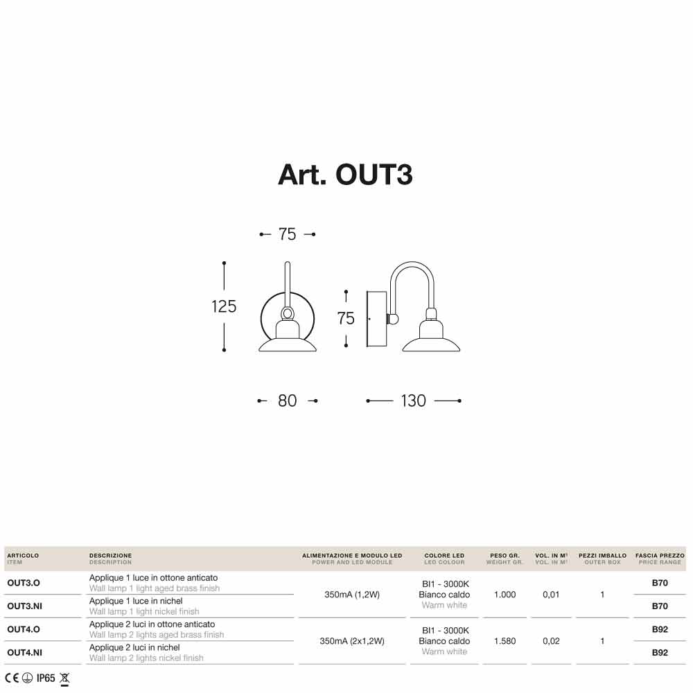 Designer Wandleuchte Bugatti von Aldo Bernardi , erhältlich mit Nischen- oder Antikmessing-Finish.