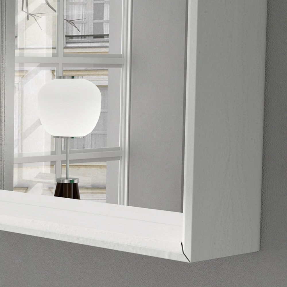 rechteckige Design-Wandspiegel , der in zwei Größen erhältlich ist, zeichnet sich durch seinen eleganten kastenförmigen Rahmen aus mattweiß lackiertem Holz aus, der ihm ein modernes und originelles Aussehen verleiht.