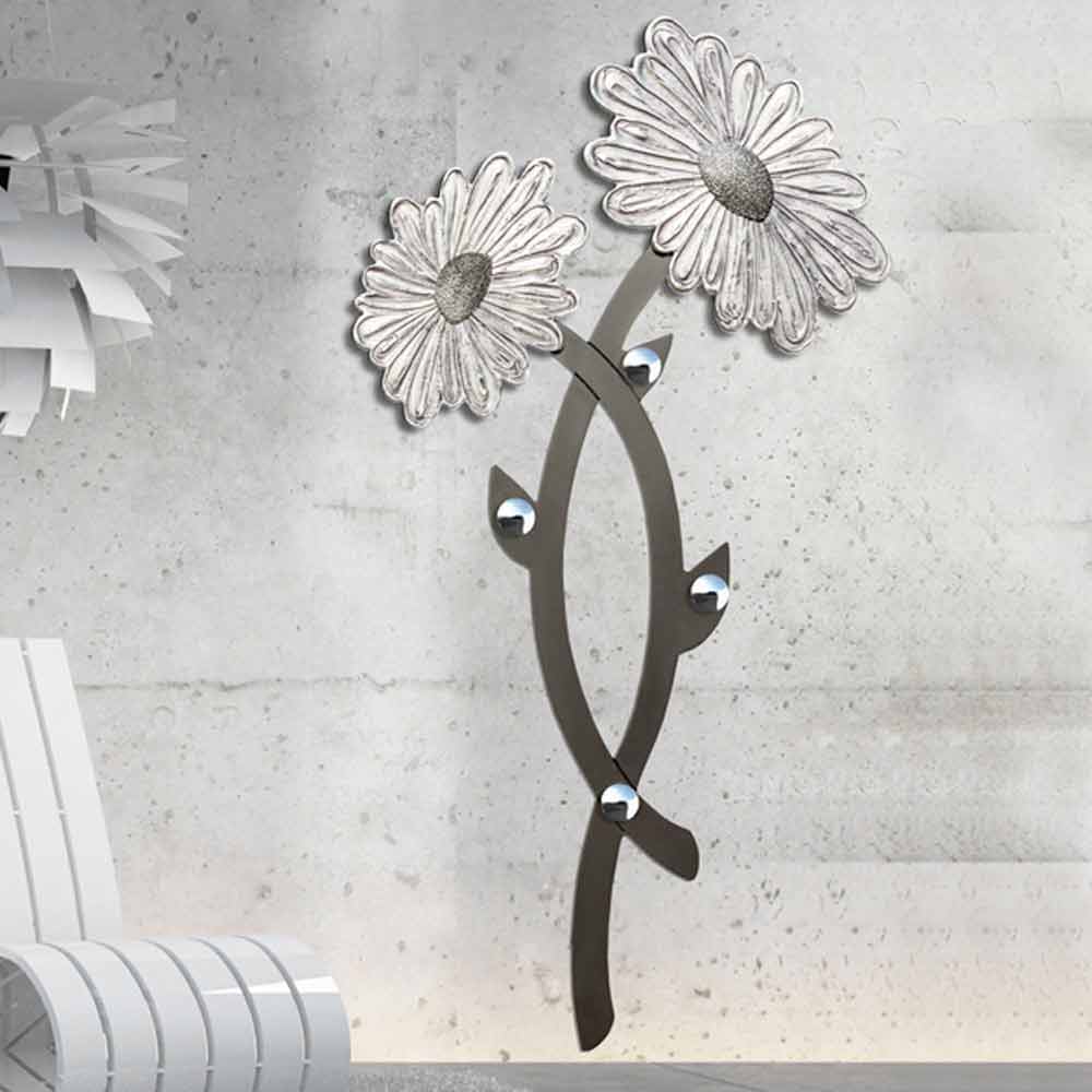 Das Gestell ist in anthrazitfarben lackiert und besteht aus zwei Blumenelementen mit Blattsilber Dekorationen im Prägedruck und 4 verchromte Haken.