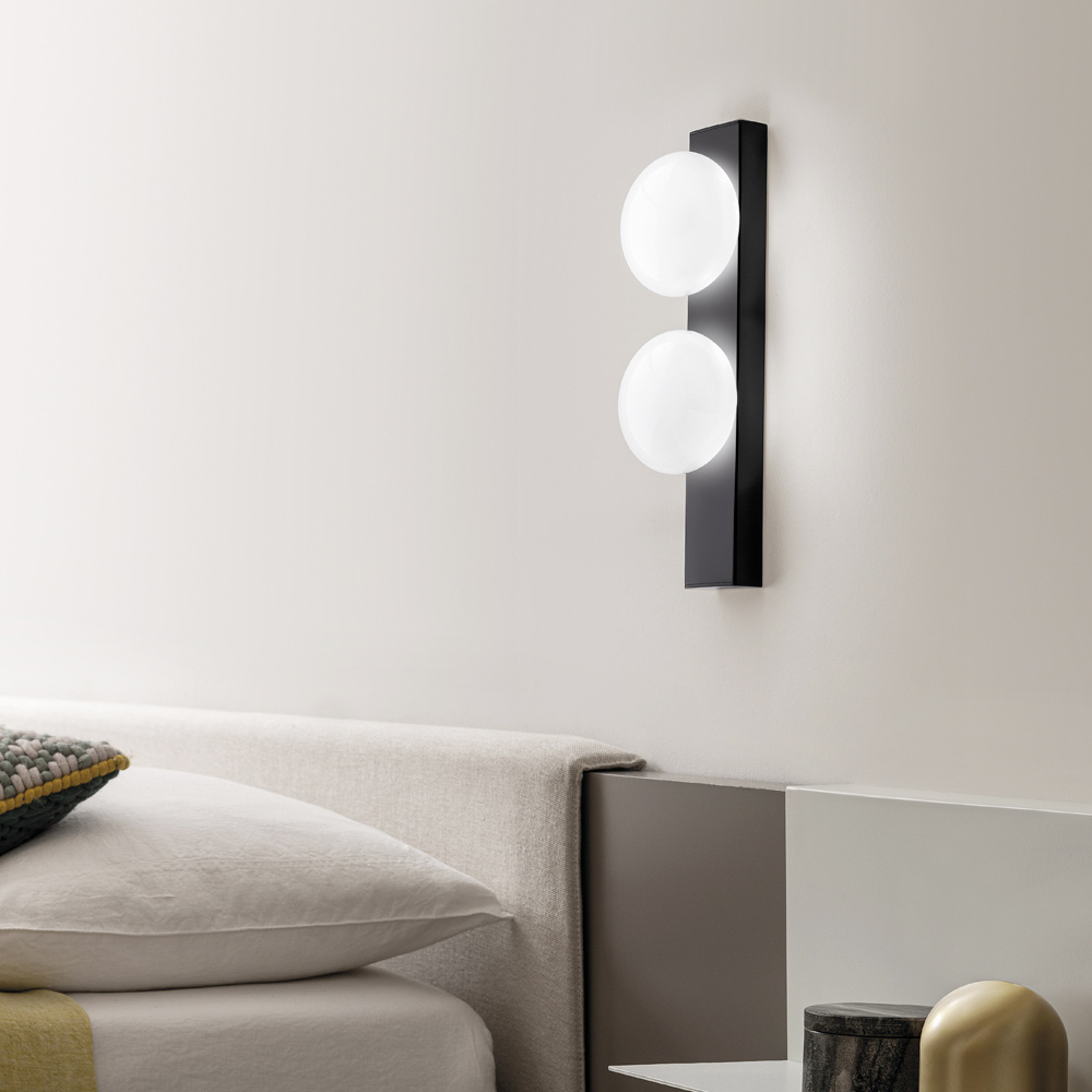 Diese Wandleuchte ist die perfekte Mischung aus geometrischem Design und raffiniertem Minimalismus . Die essentielle Komposition wird durch eine oder zwei leuchtende Opalglaskugeln verstärkt, die ein weiches, einladendes Licht verbreiten, ideal für die Schaffung einer entspannenden und anspruchsvollen Atmosphäre.