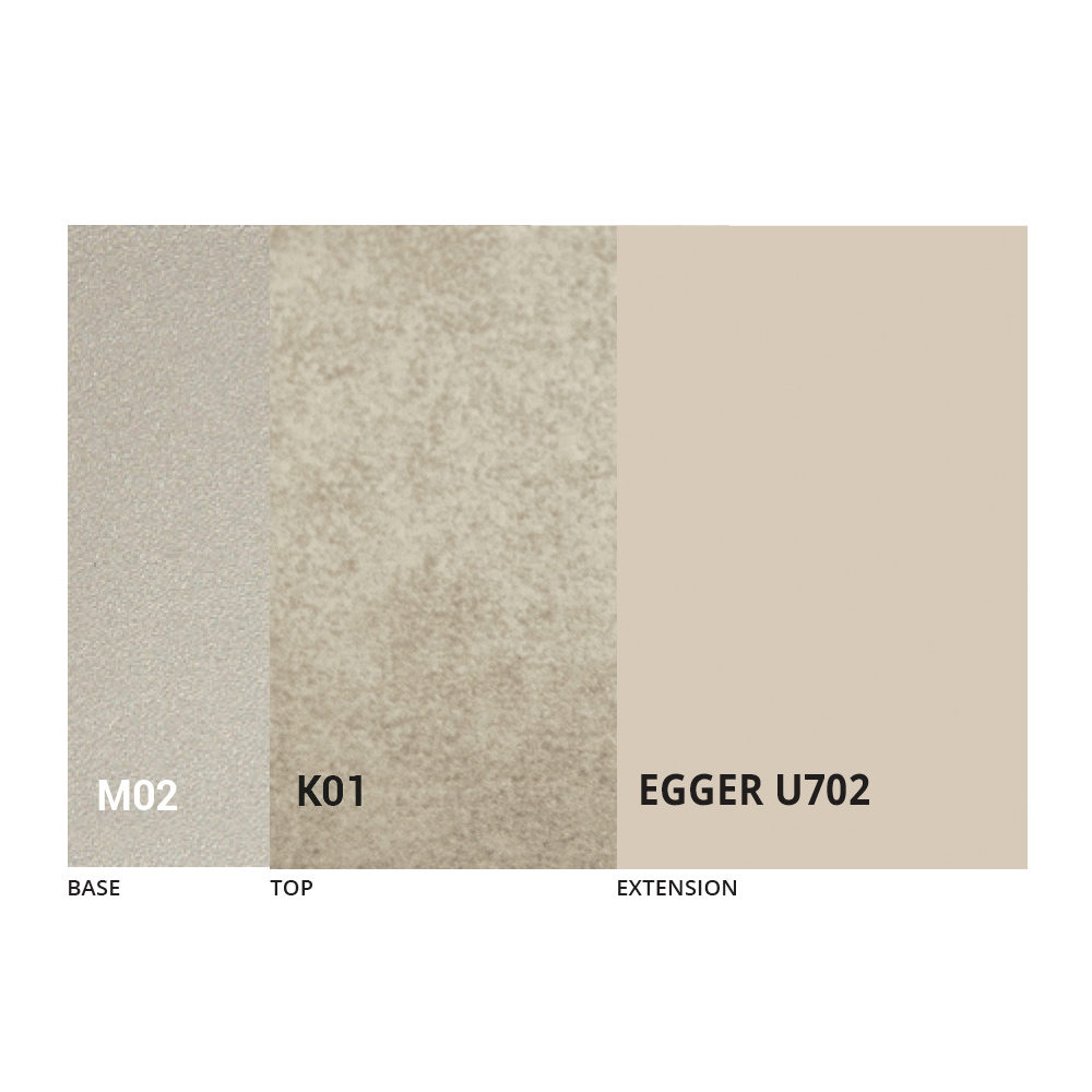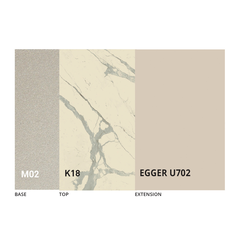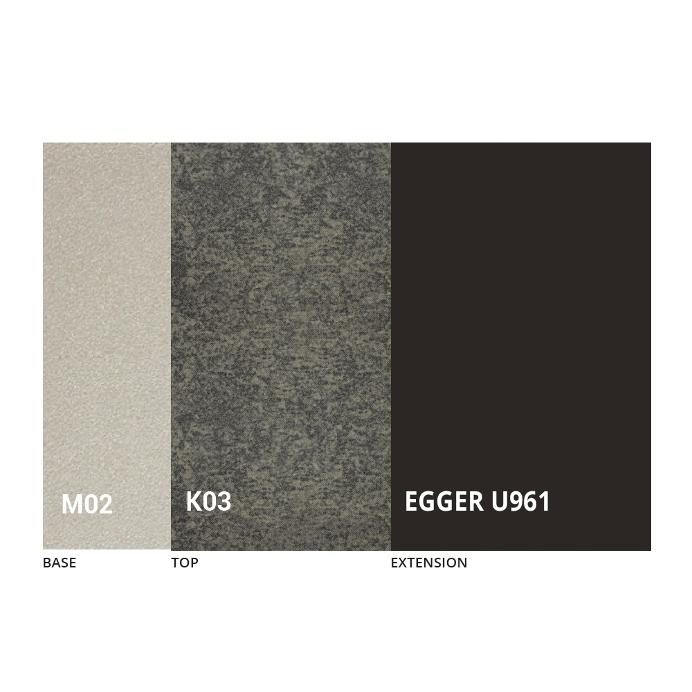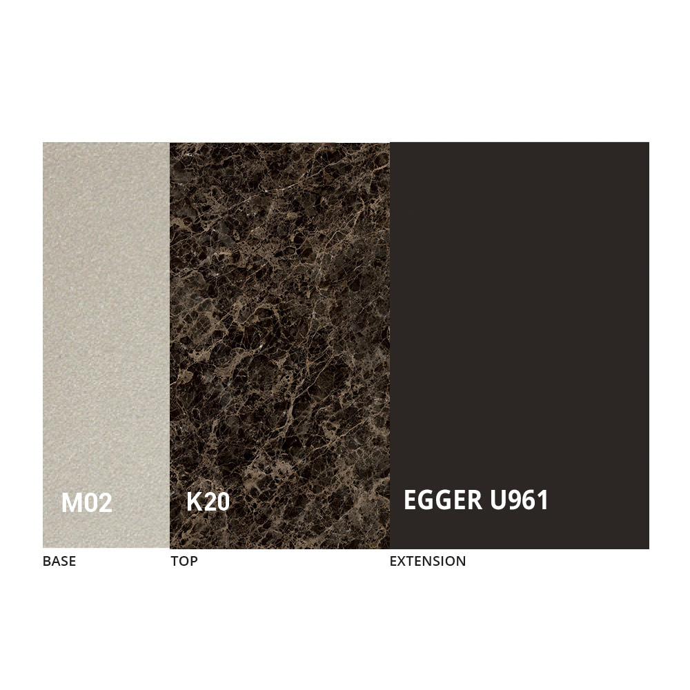 Die Platte ist in Melamin, Keramik matt, Glas und Mörteloptik in einer breiten Palette von Oberflächen erhältlich.