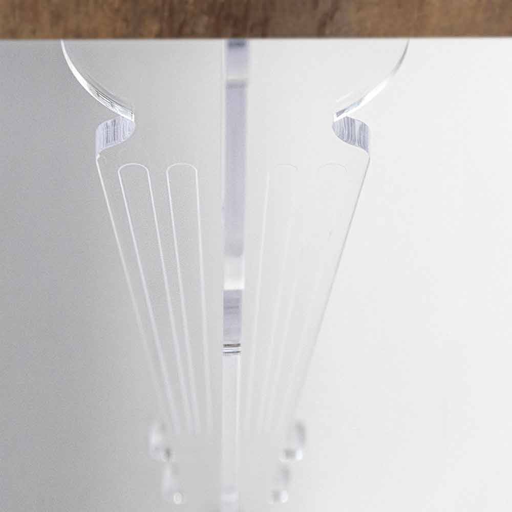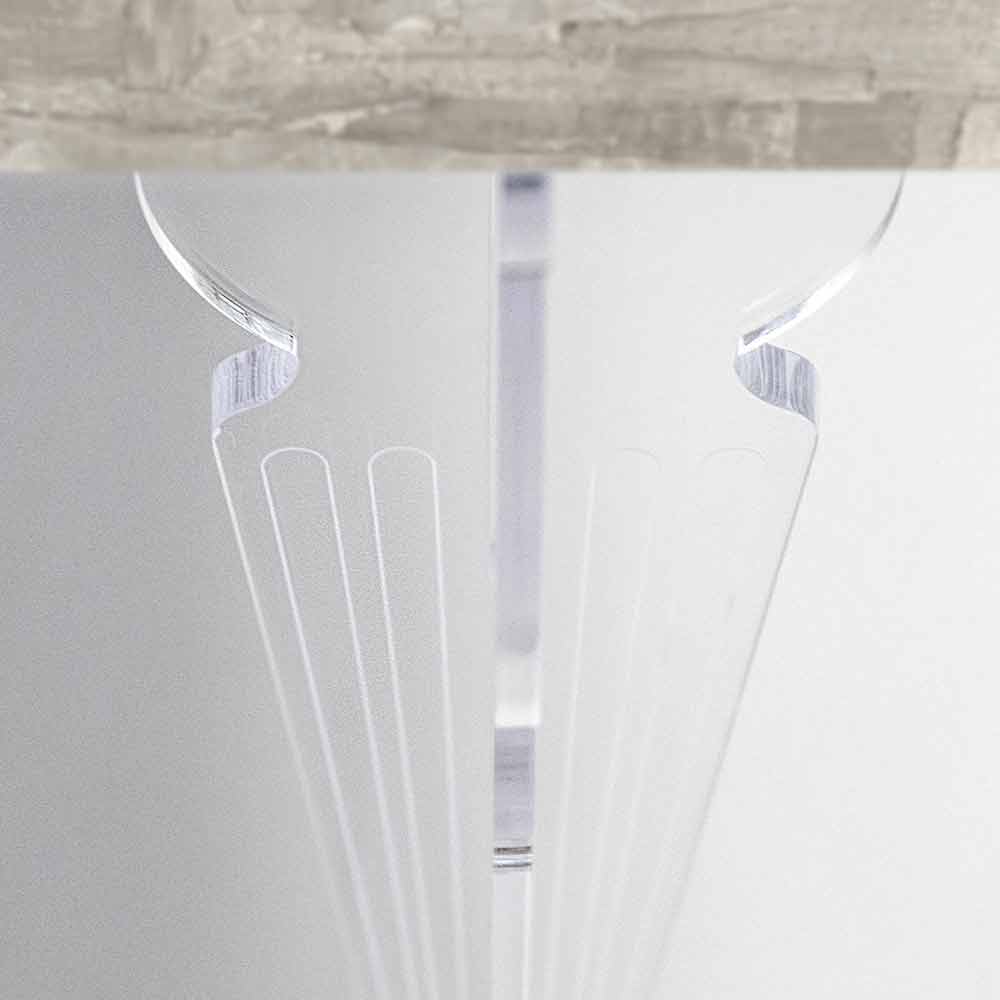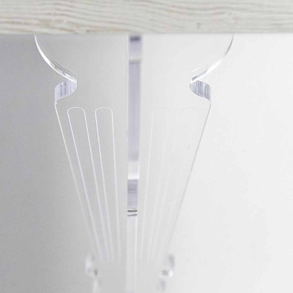 gedrehten Beine aus reinem PMMA-Plexiglas aus jungfräulichem Acrylkristallpolymer in Kombination mit der Oberseite aus Melaminholz-Essenz mit einem natürlichen, matt gebürsteten Finish sorgen für einen Effekt von