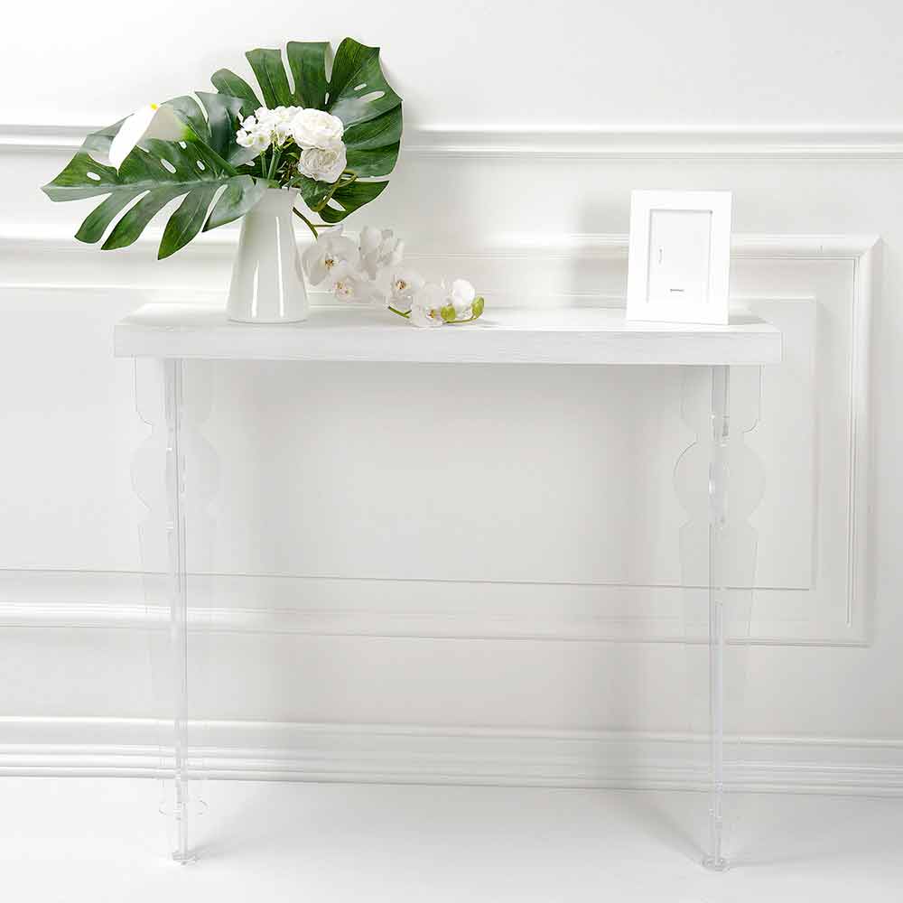 Wandkonsolentisch aus weißem, grauem oder Cortenholz mit gedrehten Beinen aus Plexiglas, Design made in Italy.