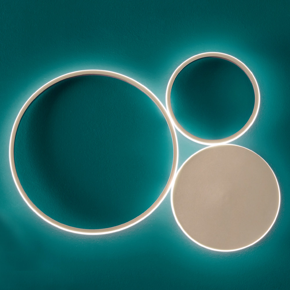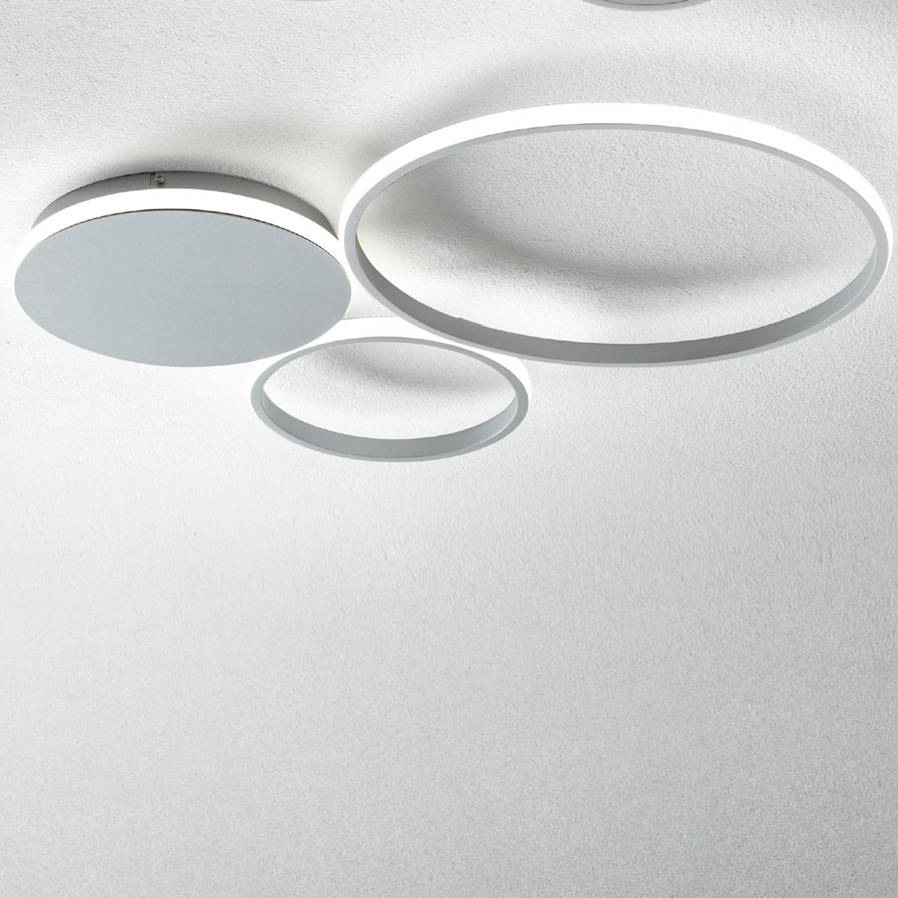 vielseitigem Charakter , das in jeder häuslichen Umgebung installiert werden kann: Eingang, Küche, Wohnbereich, Schlafzimmer. Eine originelle Komposition aus Kreisen unterschiedlicher Größe, die zusammengefügt und außen von einem milchig-weißen Diffusor bedeckt sind, der den LED-Streifen umschließt und wunderbare Lichteffekte an den Wänden für ein Ergebnis mit