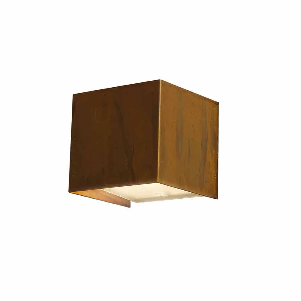 Wandlampe mit oxidierter Messingstruktur. Erhältlich in zwei Größen in der runden oder quadratischen Form. Diffusor aus gehärtetem Glas für direkte und indirekte Lichtemission.