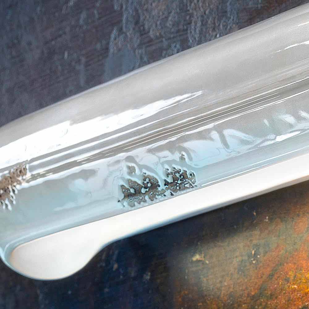 Die Besonderheit dieser Lampe liegt in der Verarbeitung ihrer äußeren Oberfläche, die so dekoriert ist, als hätte die Zeit ihren Weg gezeichnet. Die Reproduktion der Erosion der Zeit in Kombination mit den glänzenden Oberflächen verleihen dieser Wandleuchte diesen zusätzlichen Wert und machen sie perfekt für die Beleuchtung von Gemälden und Spiegeln.
