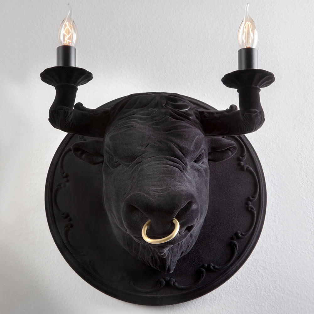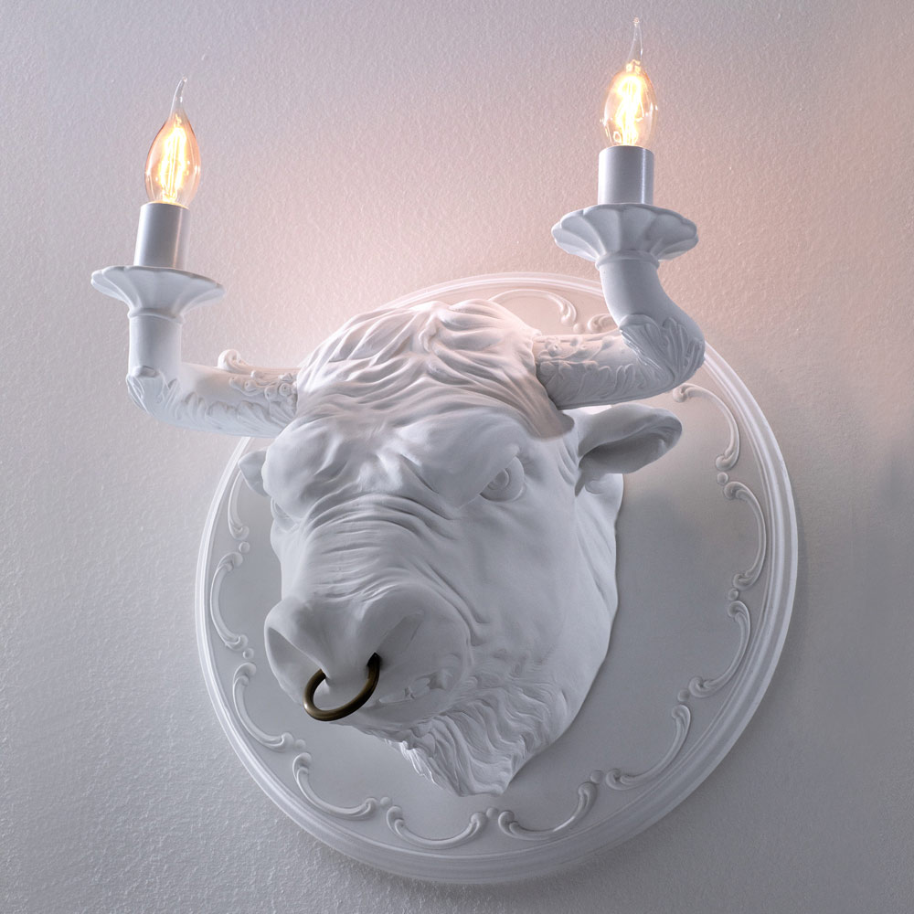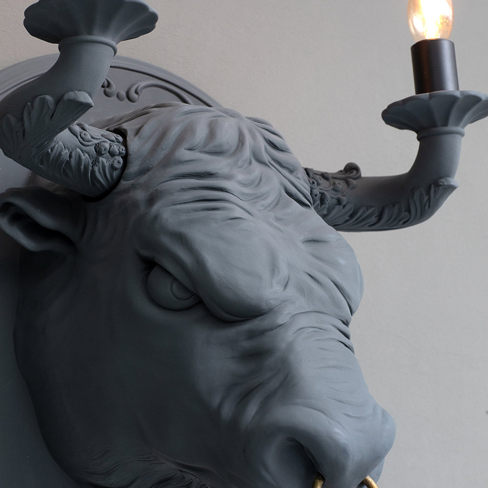 Diese originelle und einzigartige Wandleuchte hat ein modernes und niedliches Design in Form eines Stierkopfes mit Nasenring und Hörnern für Lichter, für einen leichten und raffinierten Geist.