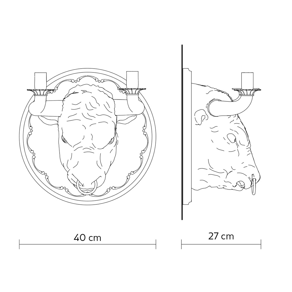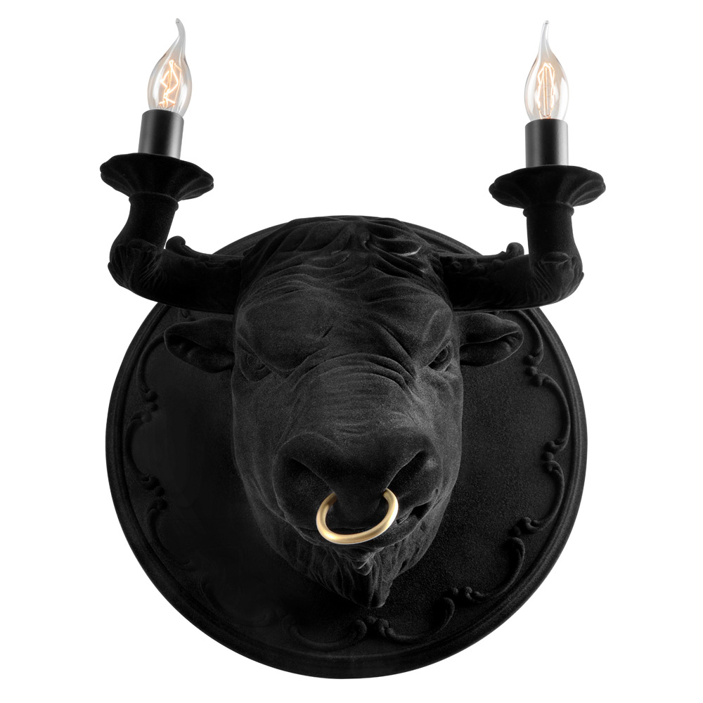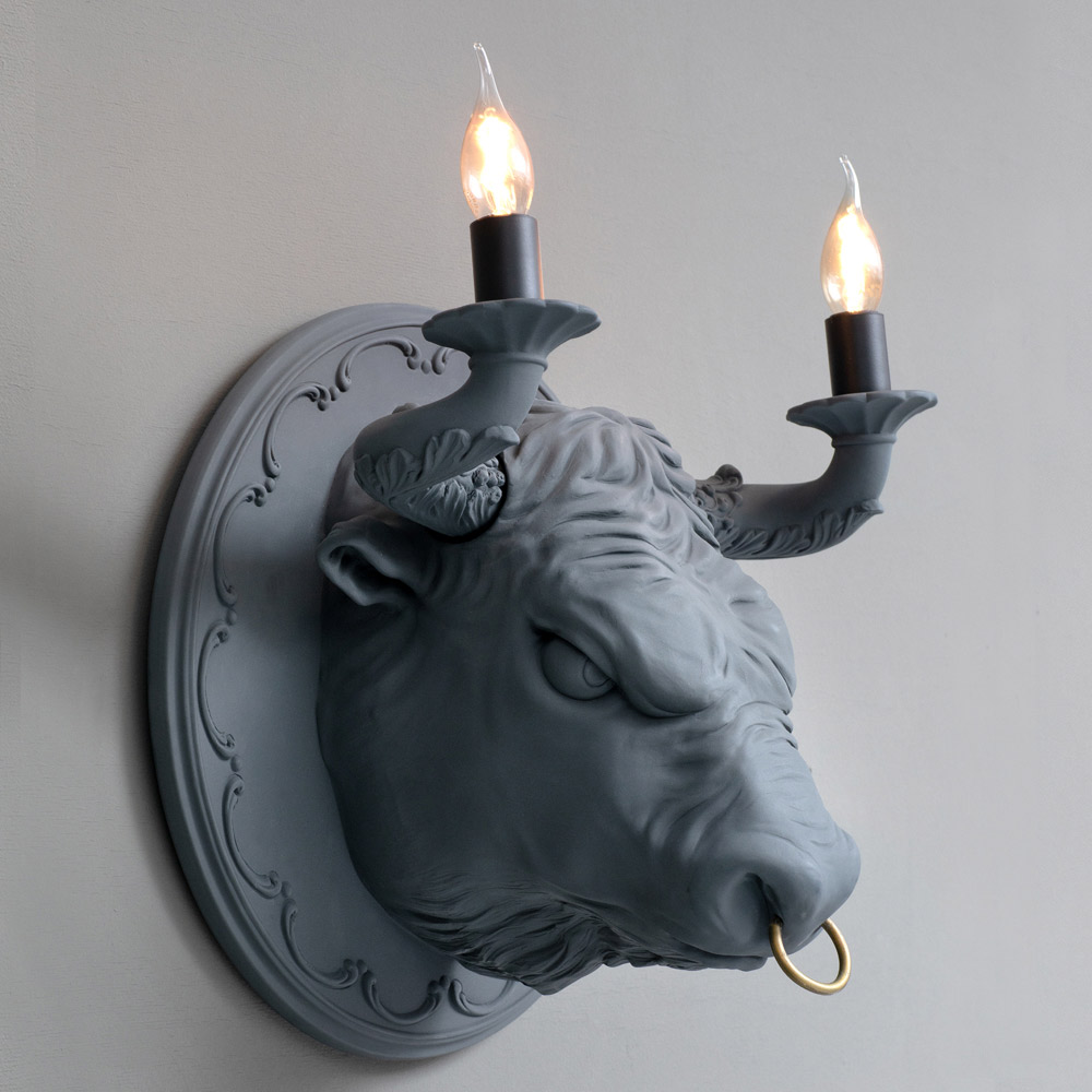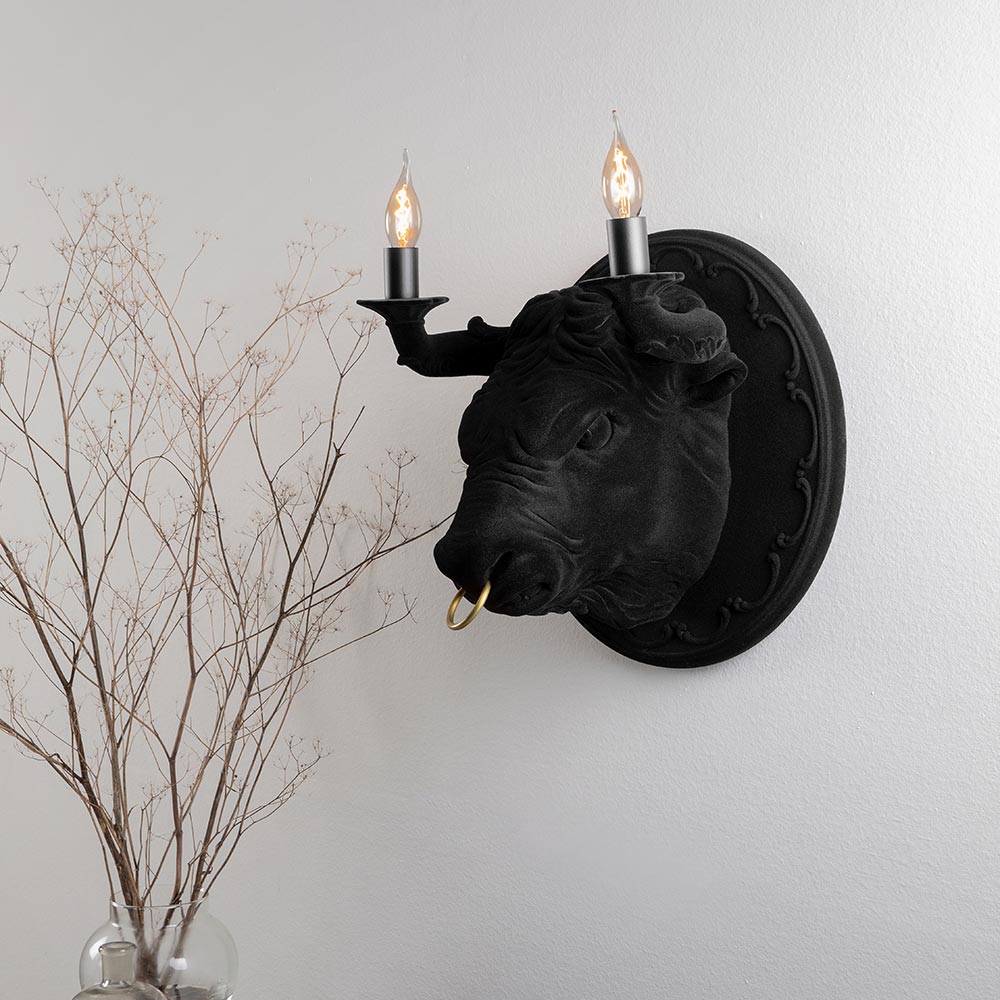 Diese originelle und einzigartige Wandleuchte hat ein modernes und niedliches Design in Form eines Stierkopfes mit Nasenring und Hörnern für Lichter, für einen leichten und raffinierten Geist.