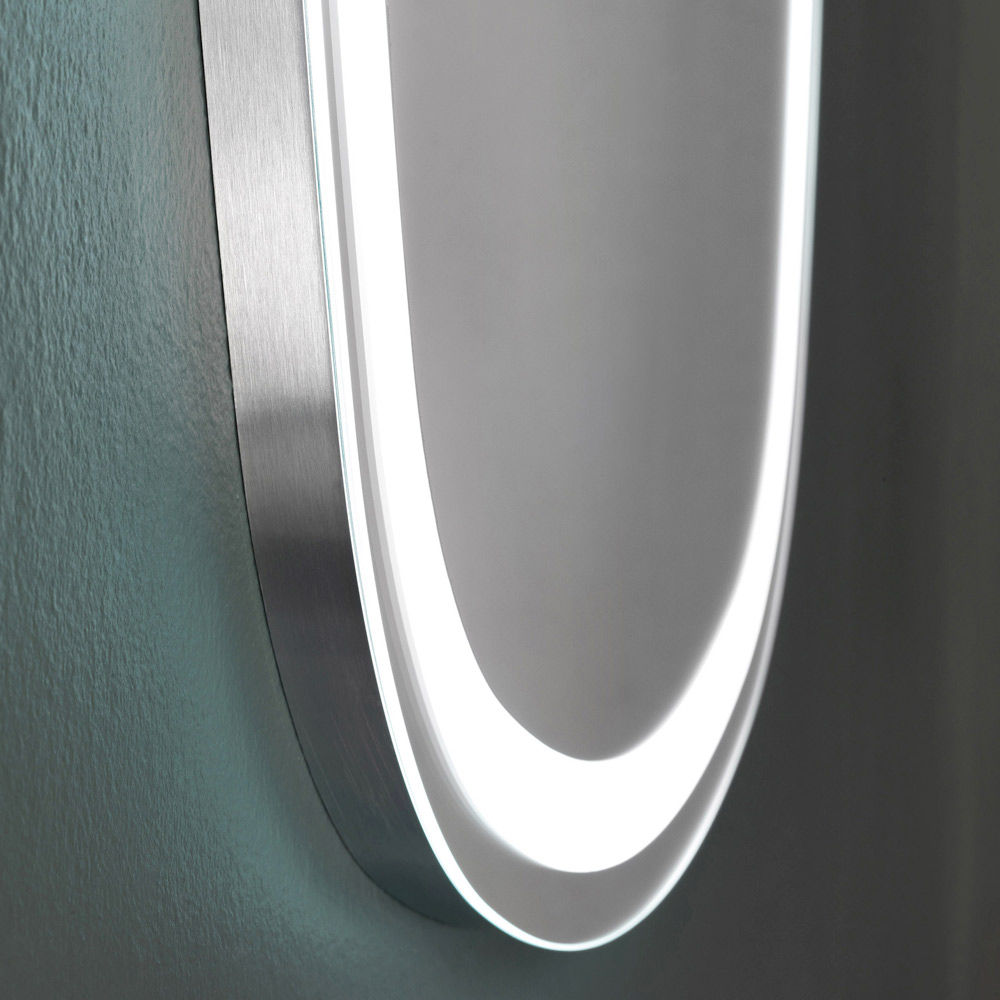Dieser Wandspiegel mit konturiertem und modernem Design verfügt über einen Edelstahlrahmen und integriertes 4000k LED-Licht.