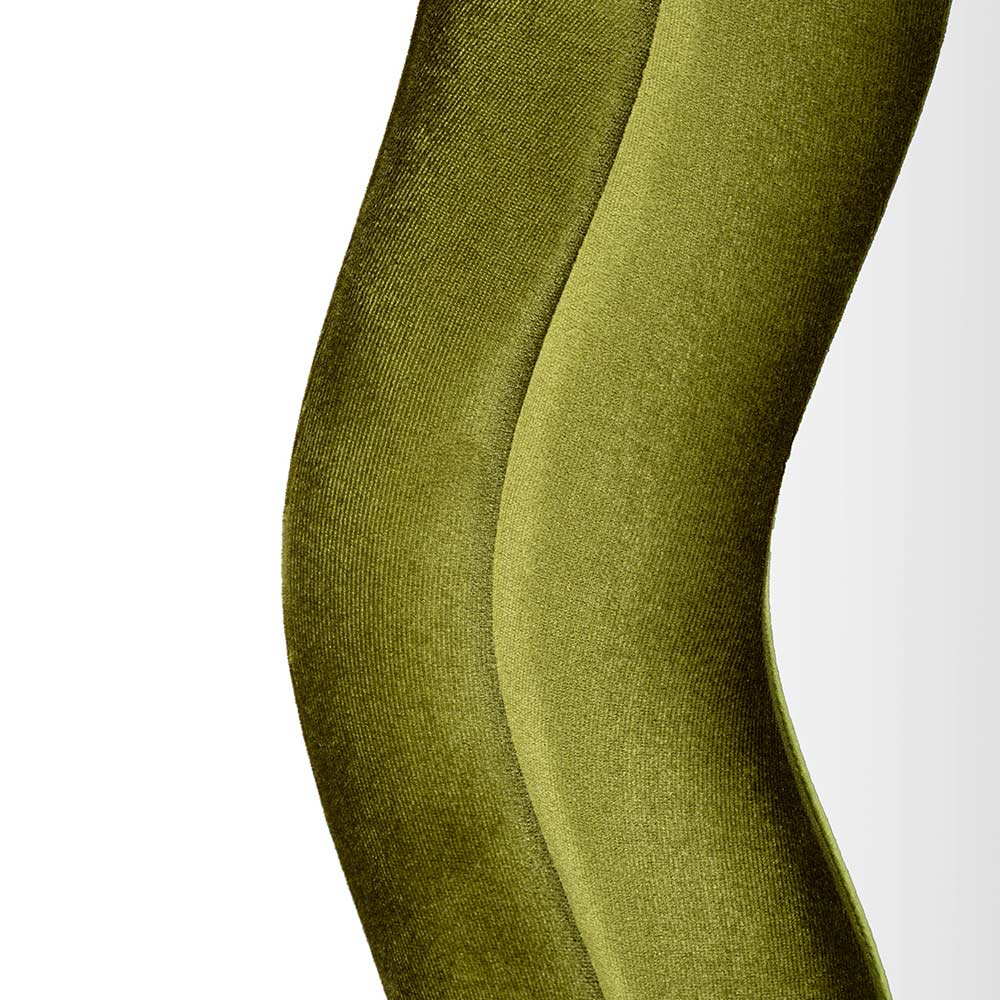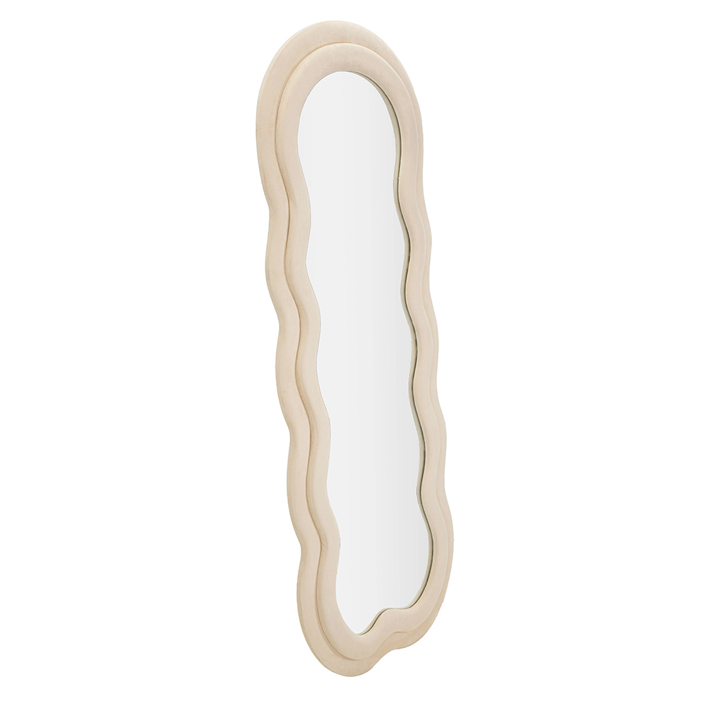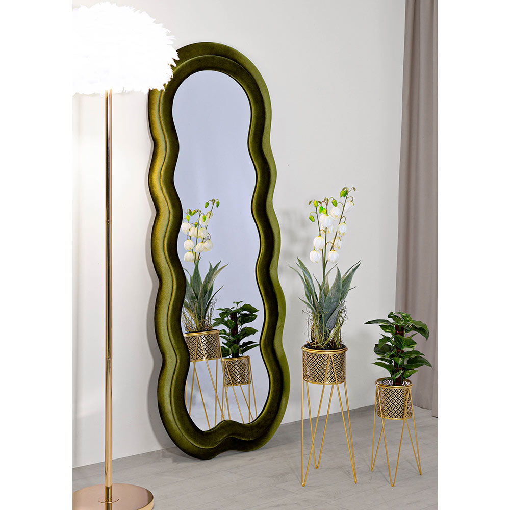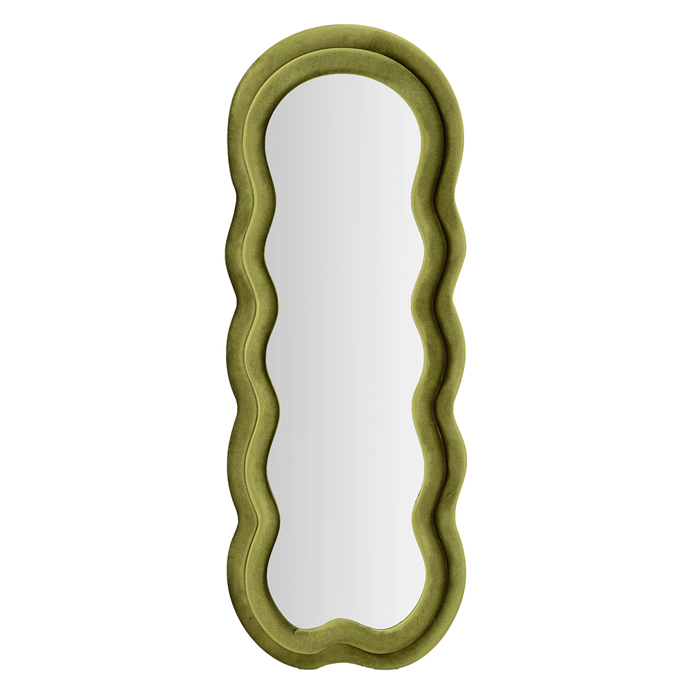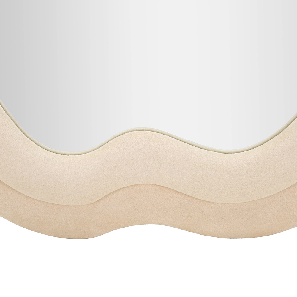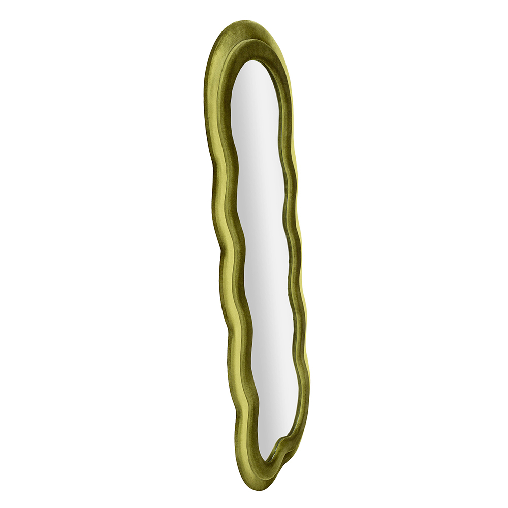 Dieser dekorative Spiegel ist ein erhabenes Beispiel dafür, wie Möbel Funktionalität und künstlerische Schönheit verbinden können. Mit seinem gewellten Rahmen und den geschwungenen Linien spricht dieses Stück eine Sprache fließender Eleganz und modernen Designs . Das Samtfinish unterstreicht seine organische Form und macht ihn zu einer perfekten Ergänzung für farbige oder neutrale Wände, die mit einer Vielzahl von Paletten harmonieren kann.