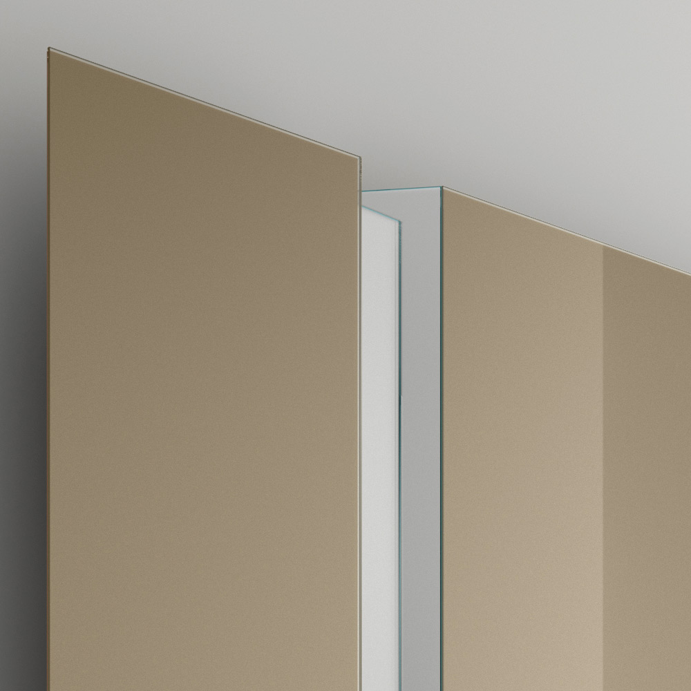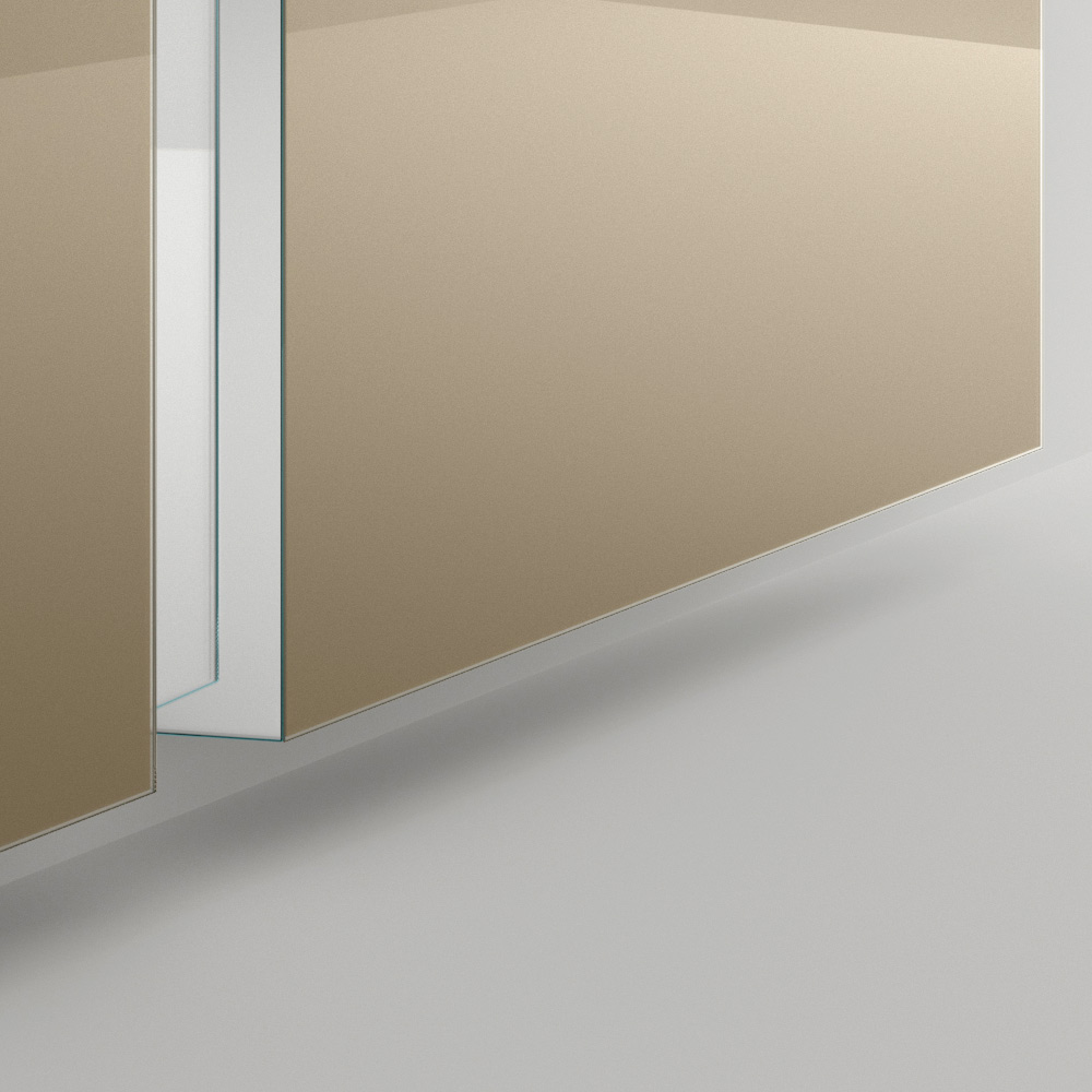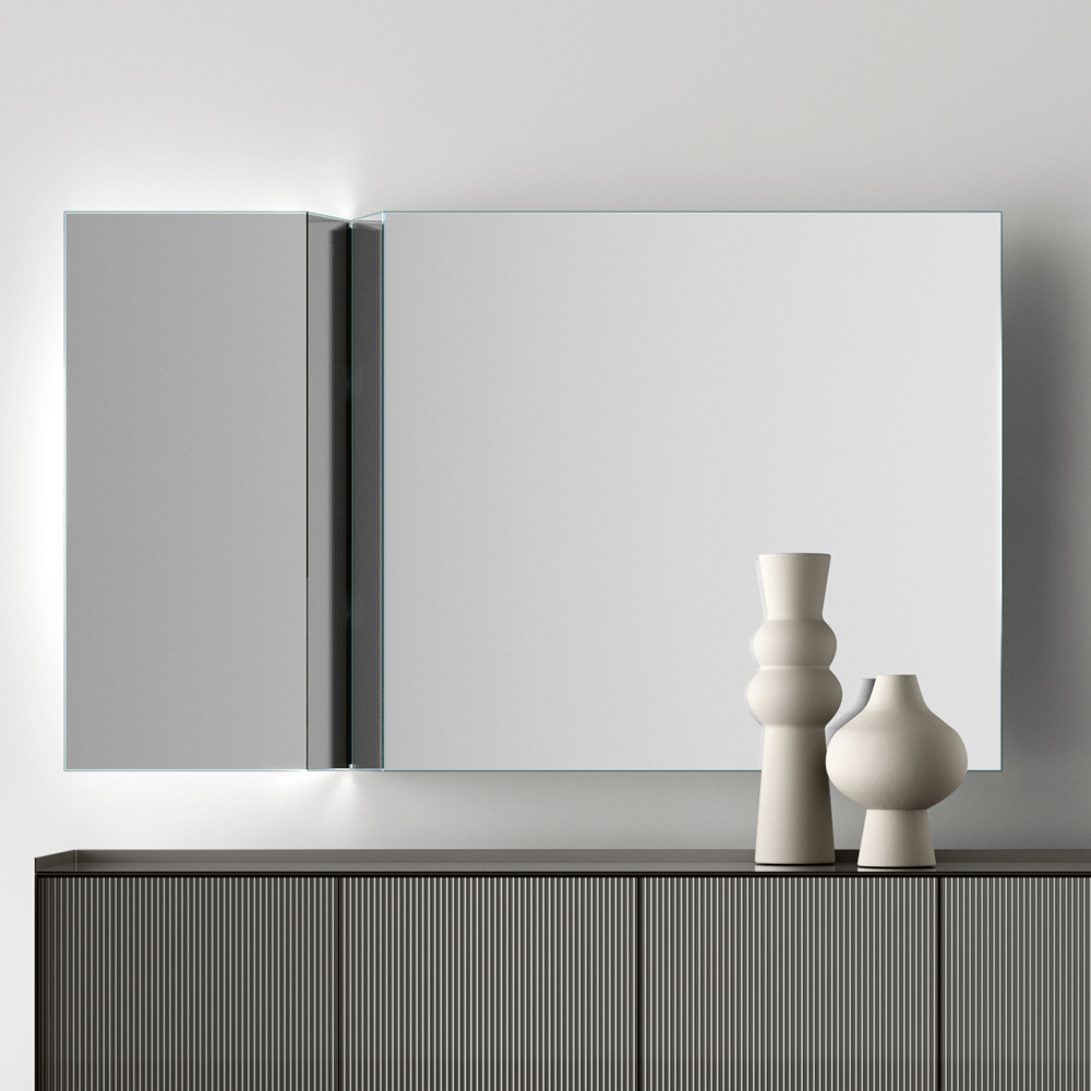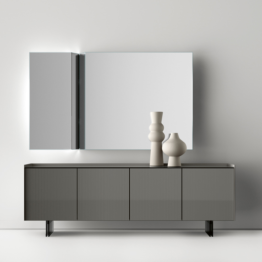 Die zweiteilige Struktur ist nicht nur optisch ansprechend, sondern verleiht auch eine einzigartige visuelle Dynamik , die jede Reflexion zu einem Kunstwerk macht. Die Verwendung hochwertiger Materialien sorgt für eine klare und präzise Reflexion, während die robuste Halterung für Haltbarkeit und Stabilität sorgt.