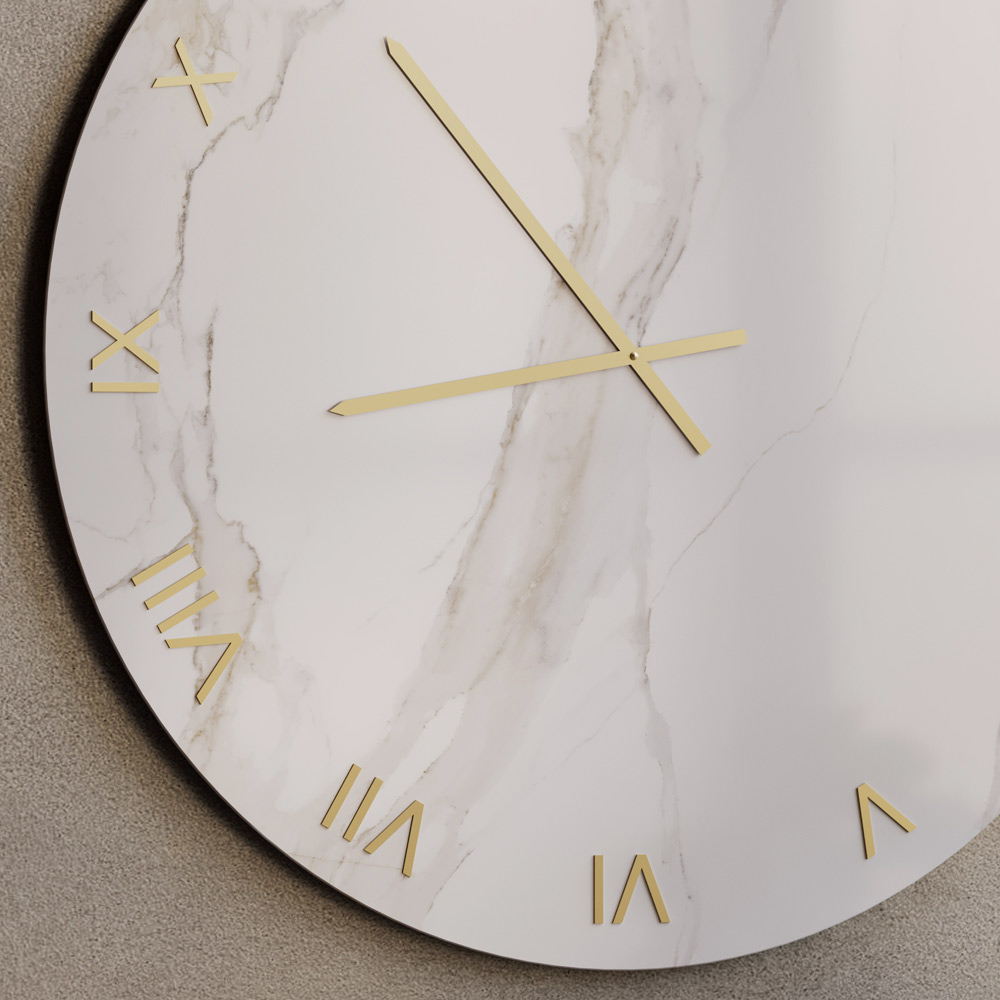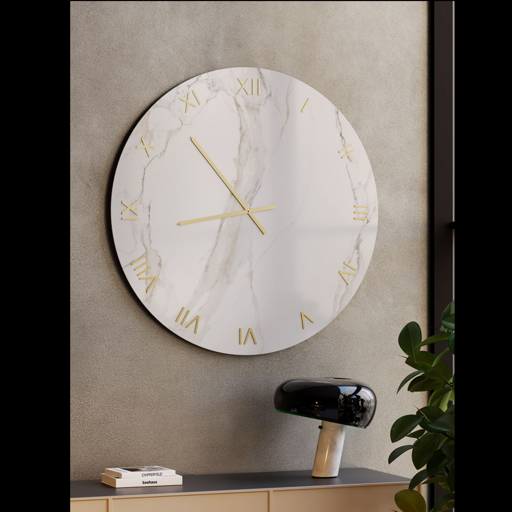 Die Glaswanduhr mit Siebdruckfinish in Calacatta-Marmoroptik ist ein edles Möbelstück, das moderne und zeitgenössische Räume mit zeitlosem Luxus bereichert. Die Glasoberfläche hebt die feine, von natürlichem Marmor inspirierte Maserung hervor und erzeugt ein elegantes Spiel von Licht und Tiefe.