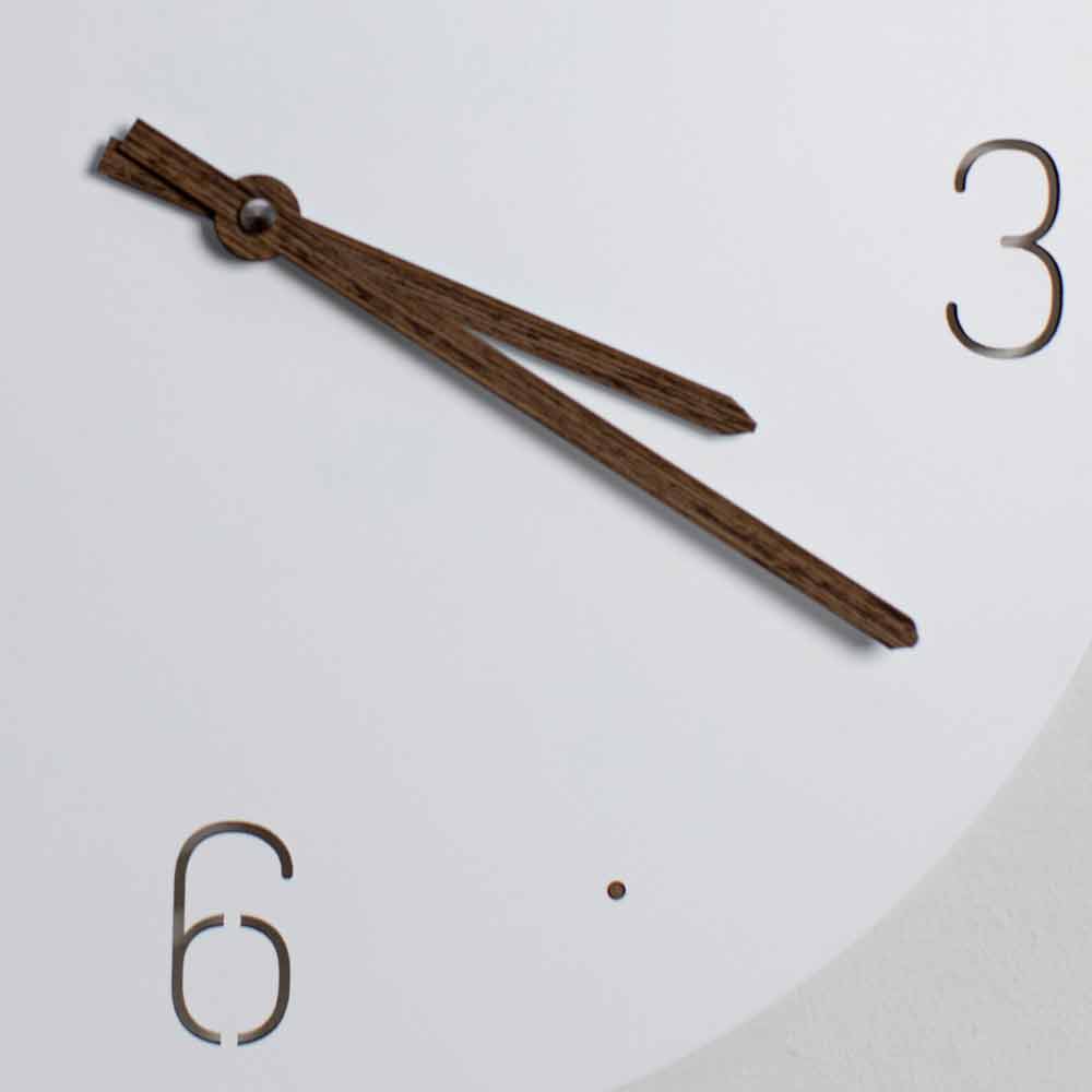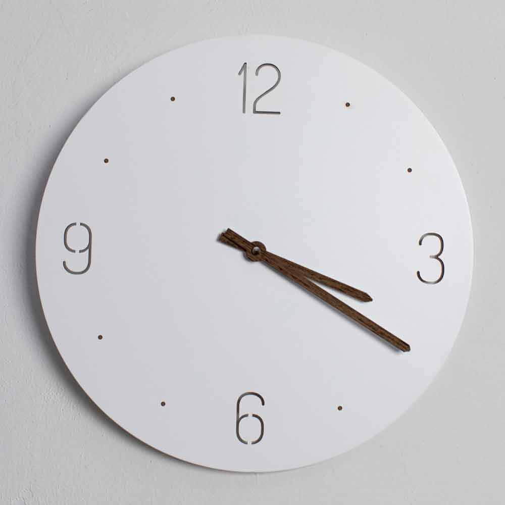 Wanduhr mit rundem und einfachem Design aus weiß lackiertem und lasergeschnittenem Holz, hergestellt in Italien.