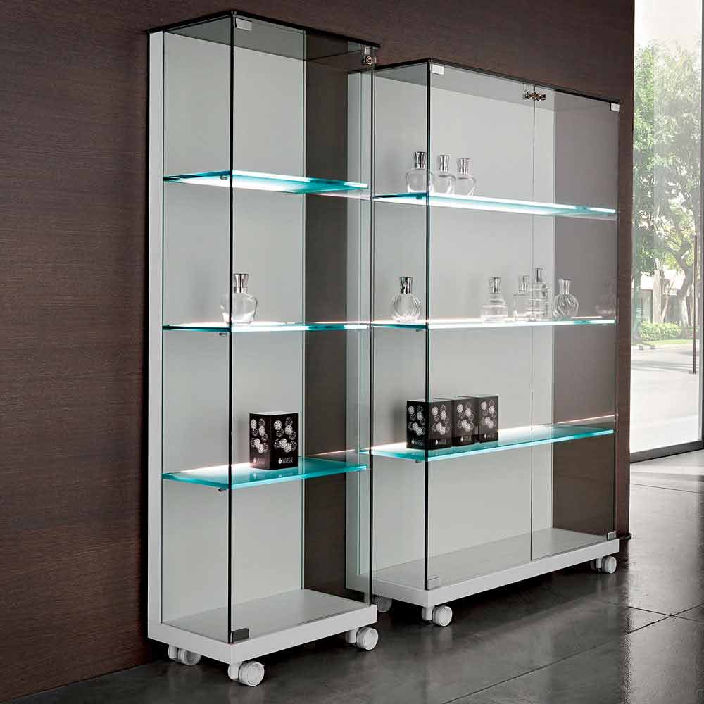 Die zweitürige Vitrine mit Rädern zur Erleichterung der Bewegung besteht aus transparentem Hartglas und einer Struktur aus mattweiß lackiertem Holz.