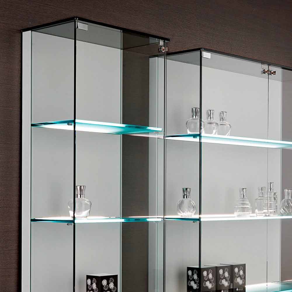 Seine Eleganz wird durch die mit LED-Licht beleuchteten säuregeätzten Glasböden mit einer maximalen Tragfähigkeit von je 7,5 kg maximal entfaltet.