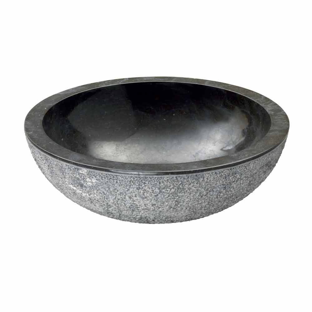 rundes Aufsatzwaschbecken aus Naturstein - schwarz- mit unbelassener rauher Oberfläche in der Außenseite Pai Modell