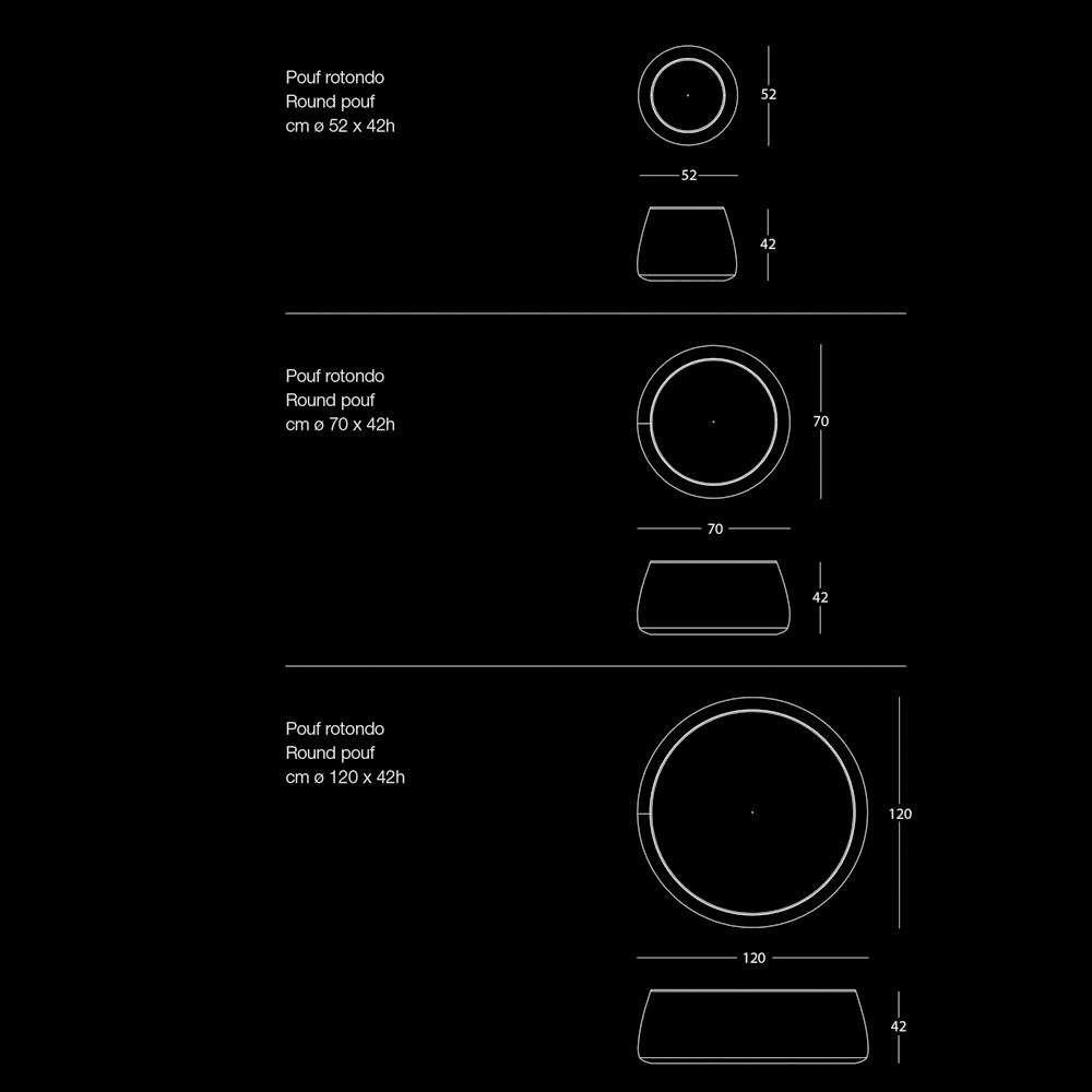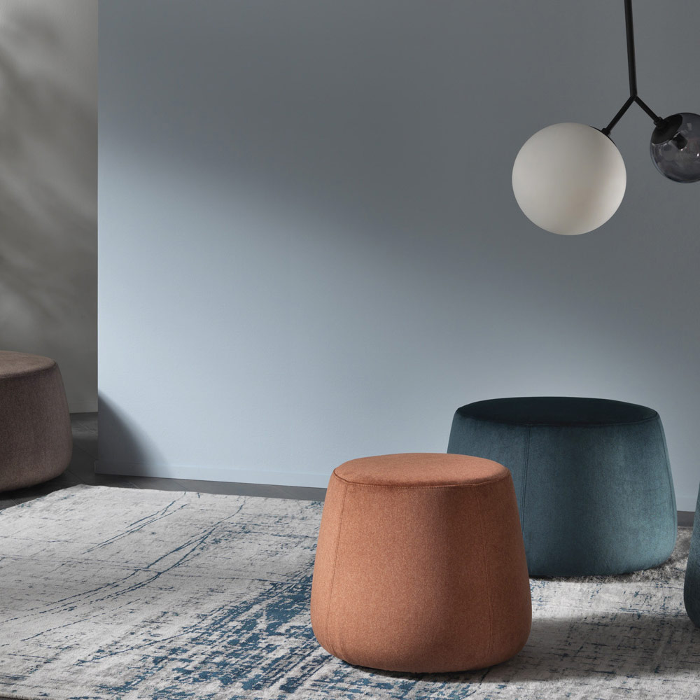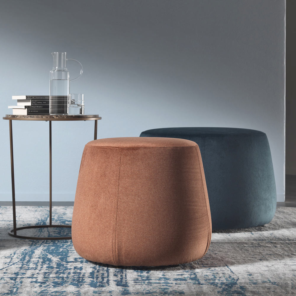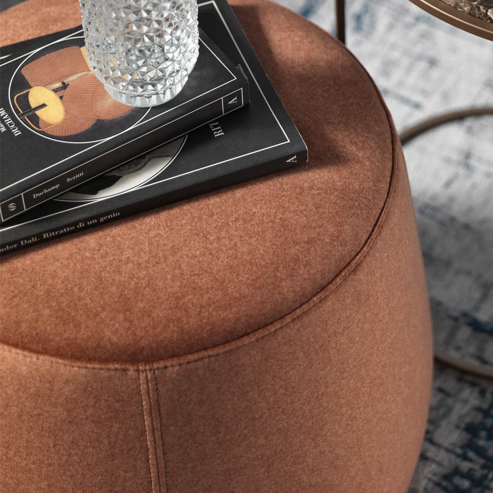 Der moderne und runde Design-Hocker , der in drei verschiedenen Breiten erhältlich ist, ist vollständig mit weichem, abnehmbarem Samt überzogen, der in 6 Ausführungen erhältlich ist.