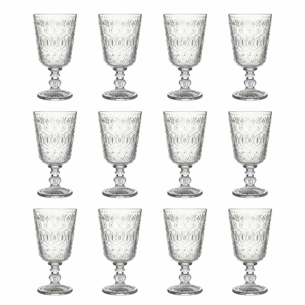 12 Weingläser aus transparent dekoriertem Glas, auch ideal für den Weihnachtstisch.