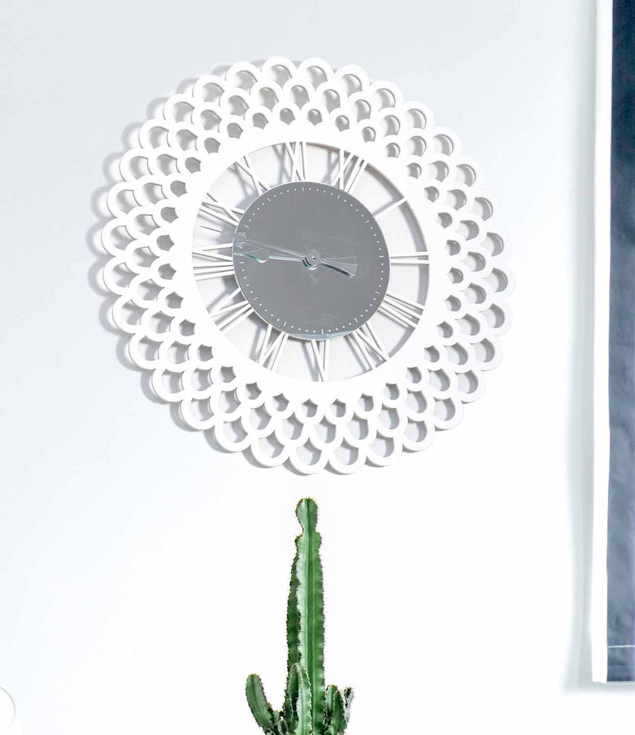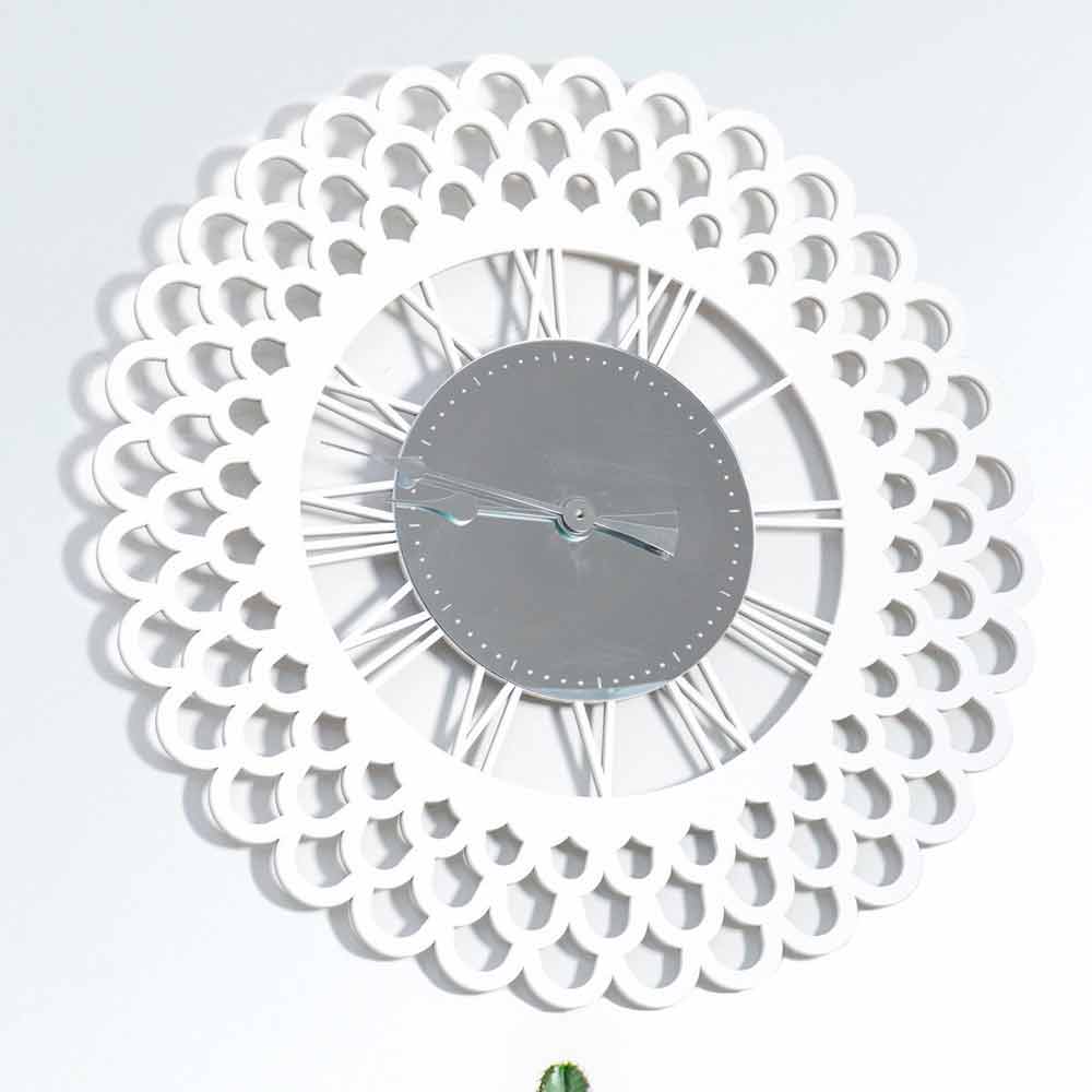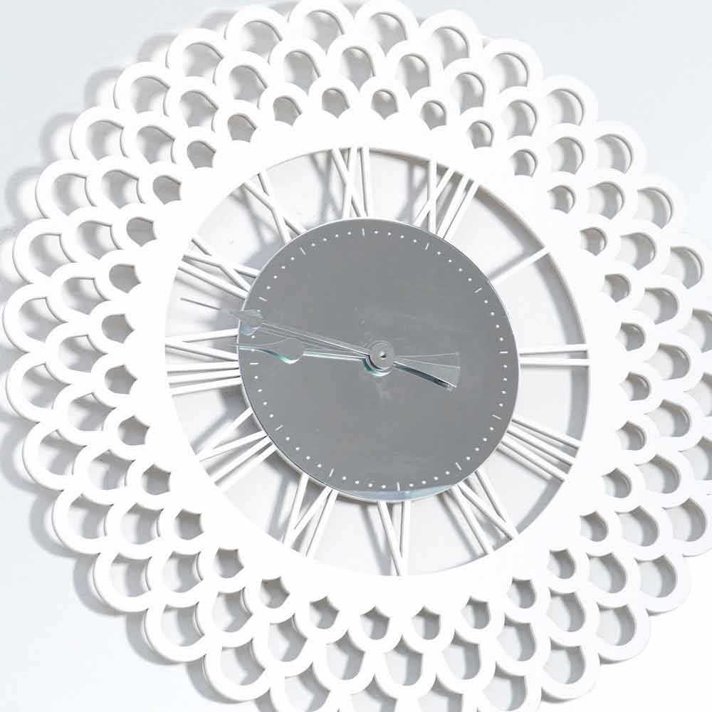 Große Wanduhr, modernes weißes Holzdesign mit Spiegeldekoration, Blumenform made in Italy.