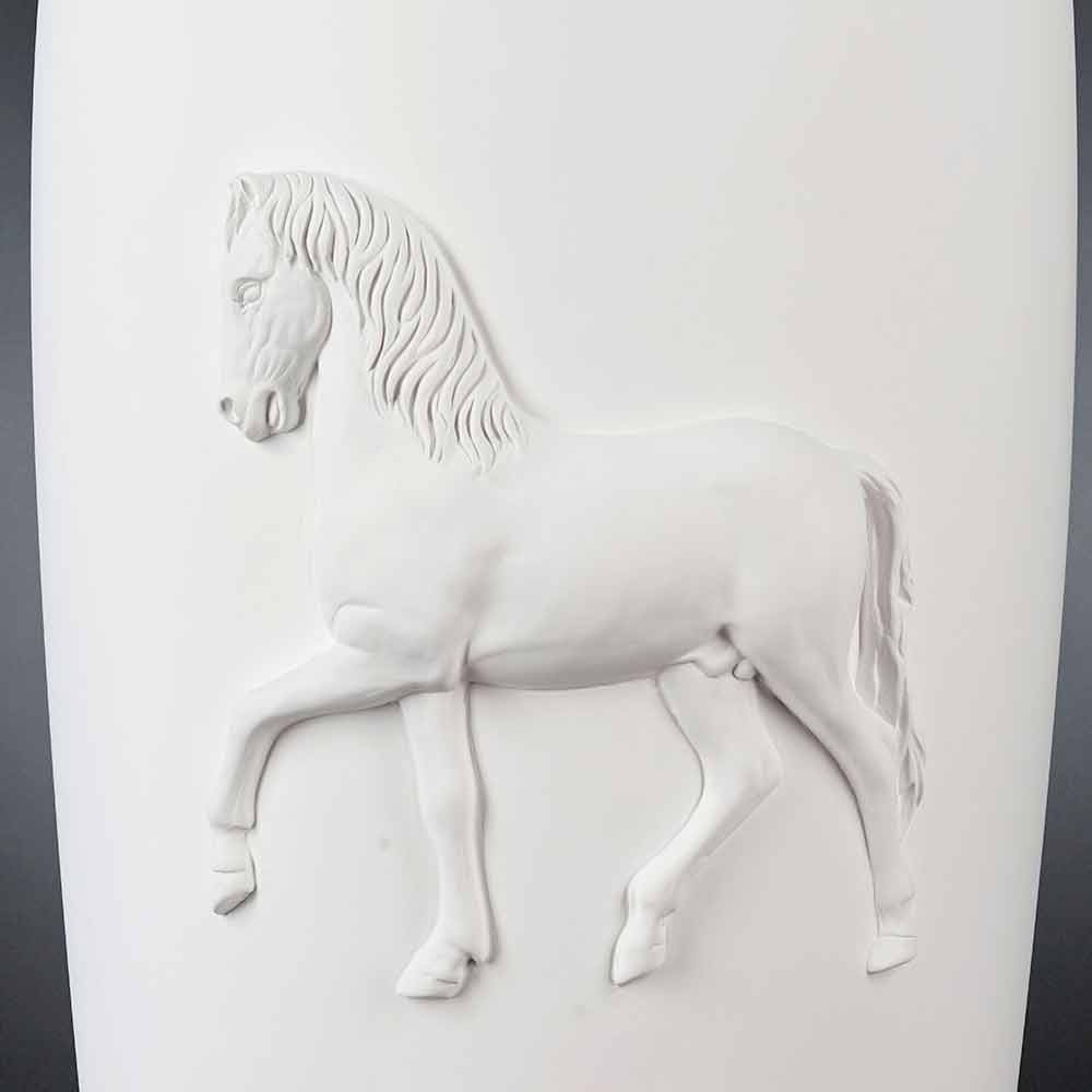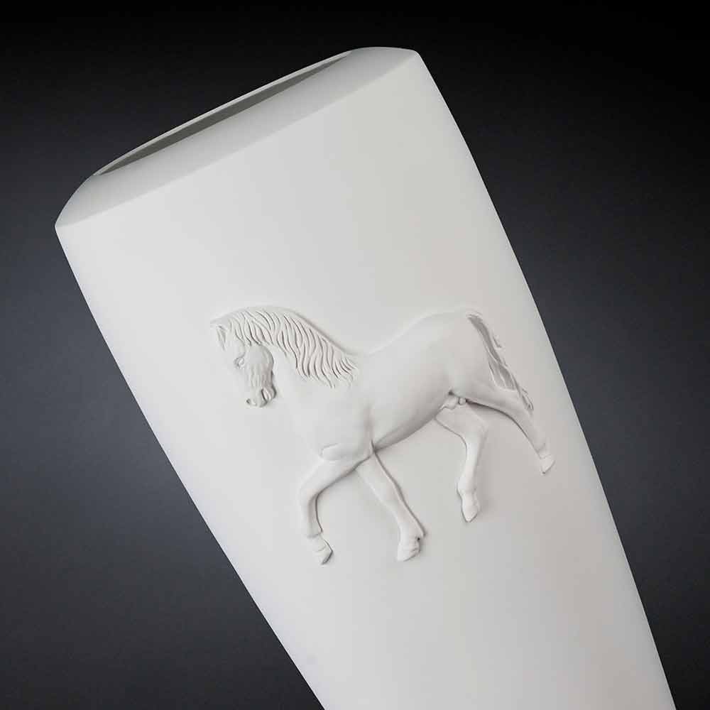 Dekorative Keramikvase, handgefertigt von italienischen Handwerkern, die sich durch ein modernes Design auszeichnet. Auf der Oberfläche ist ein Pferd geprägt.