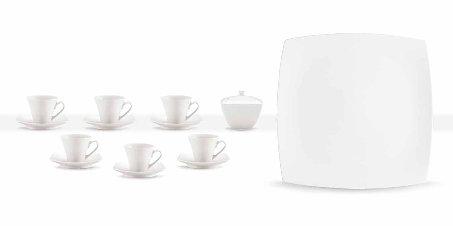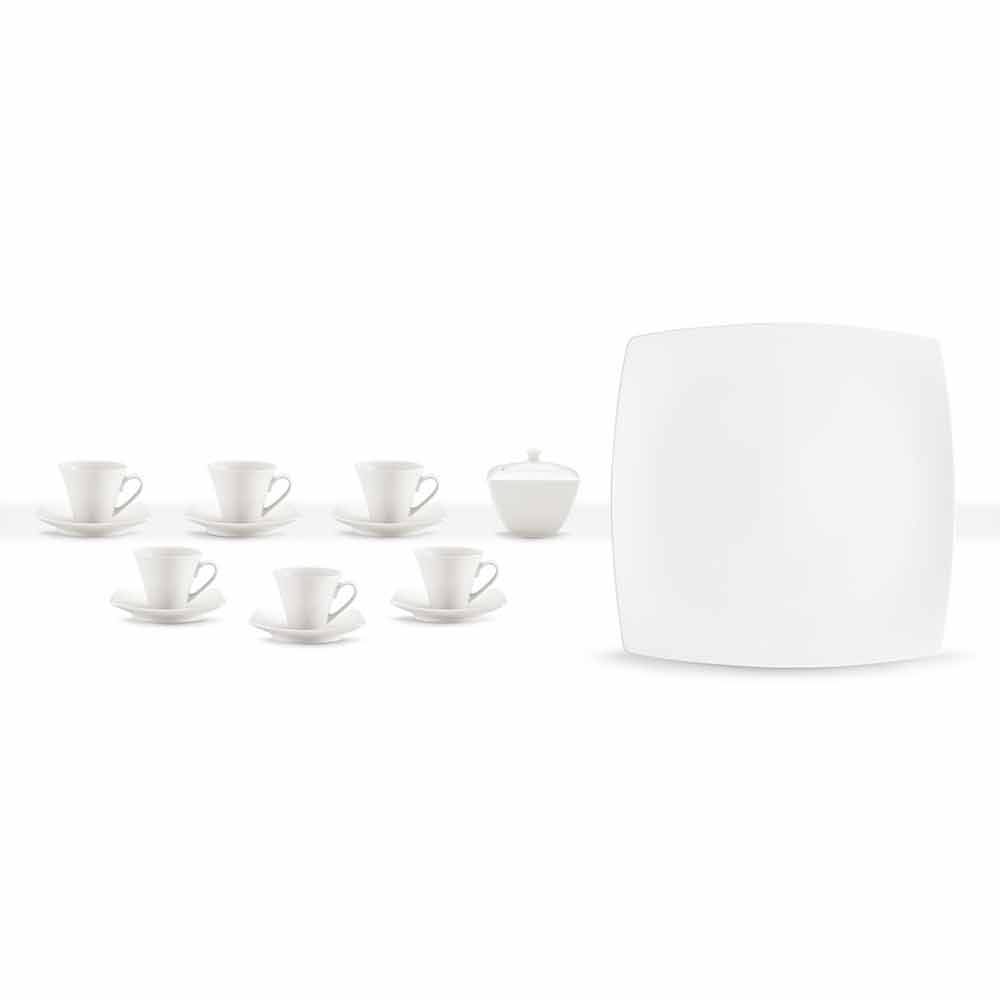 Set Kaffeetassen und Zuckerdose mit Teller, modernes Design aus weißem Porzellan, 8 Stück.