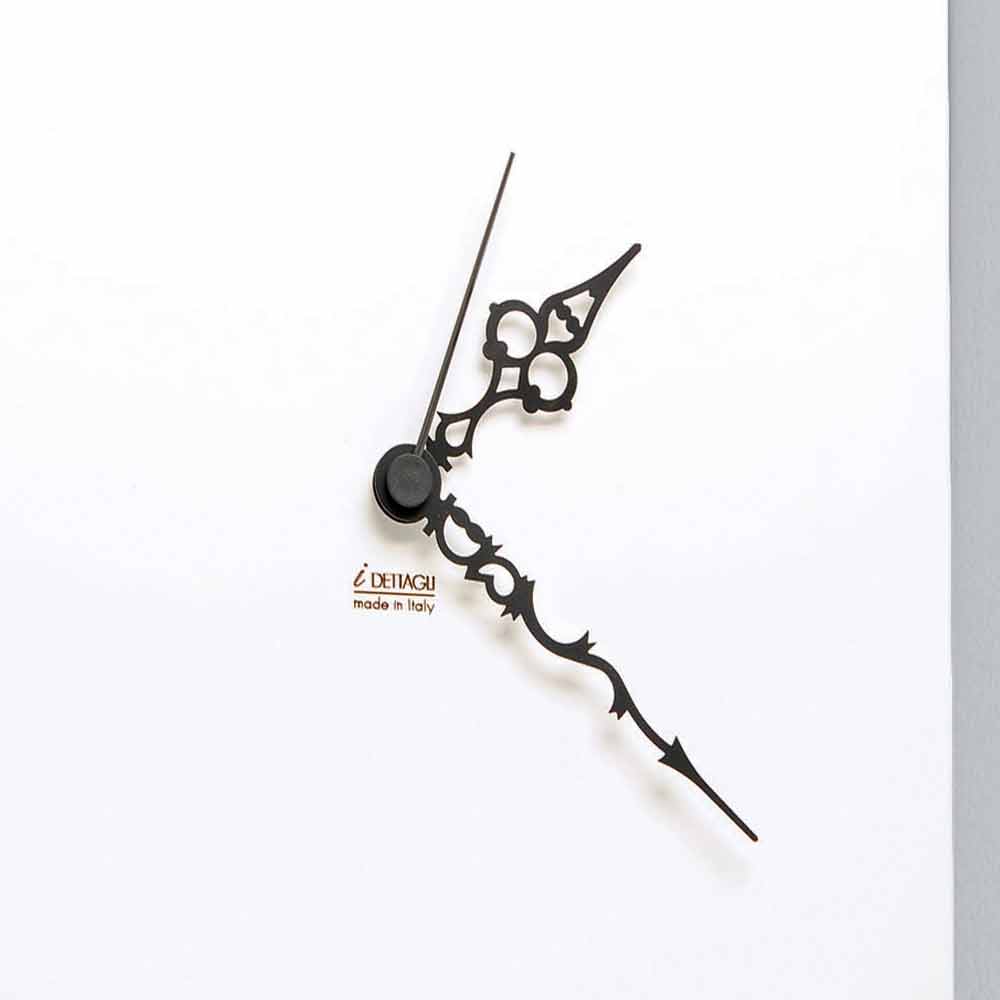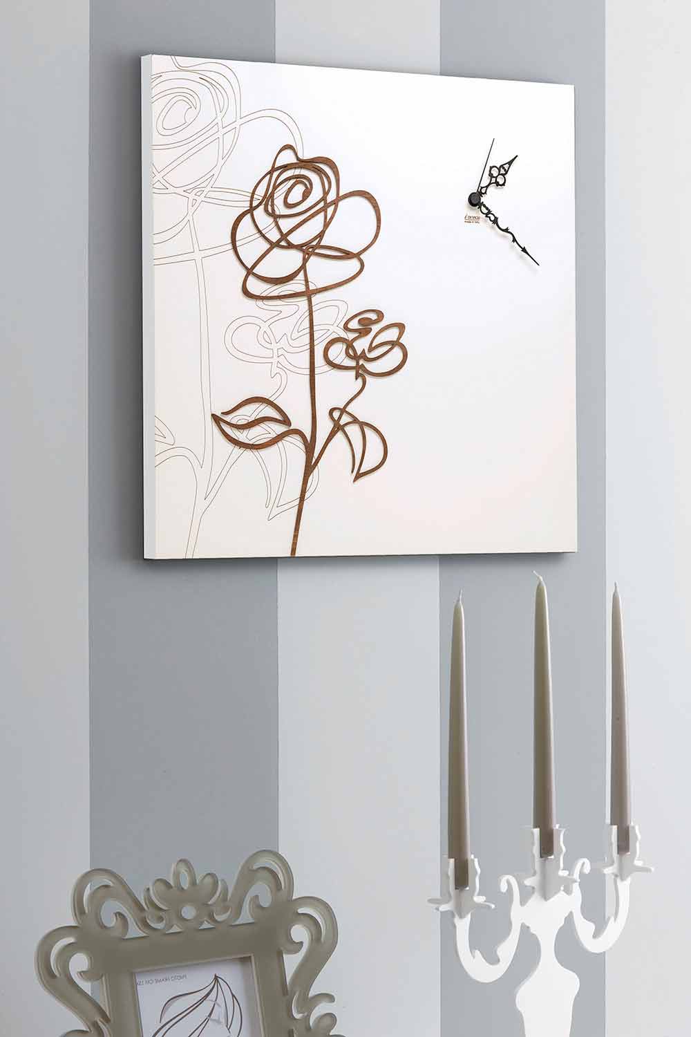 Quadratische Wanduhr aus weißem Holz mit Blumendekor aus dunklem Holz, modernes Design made in Italy.