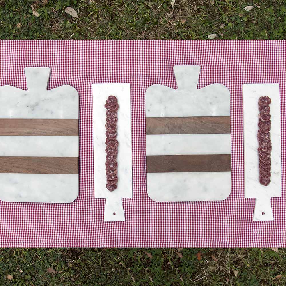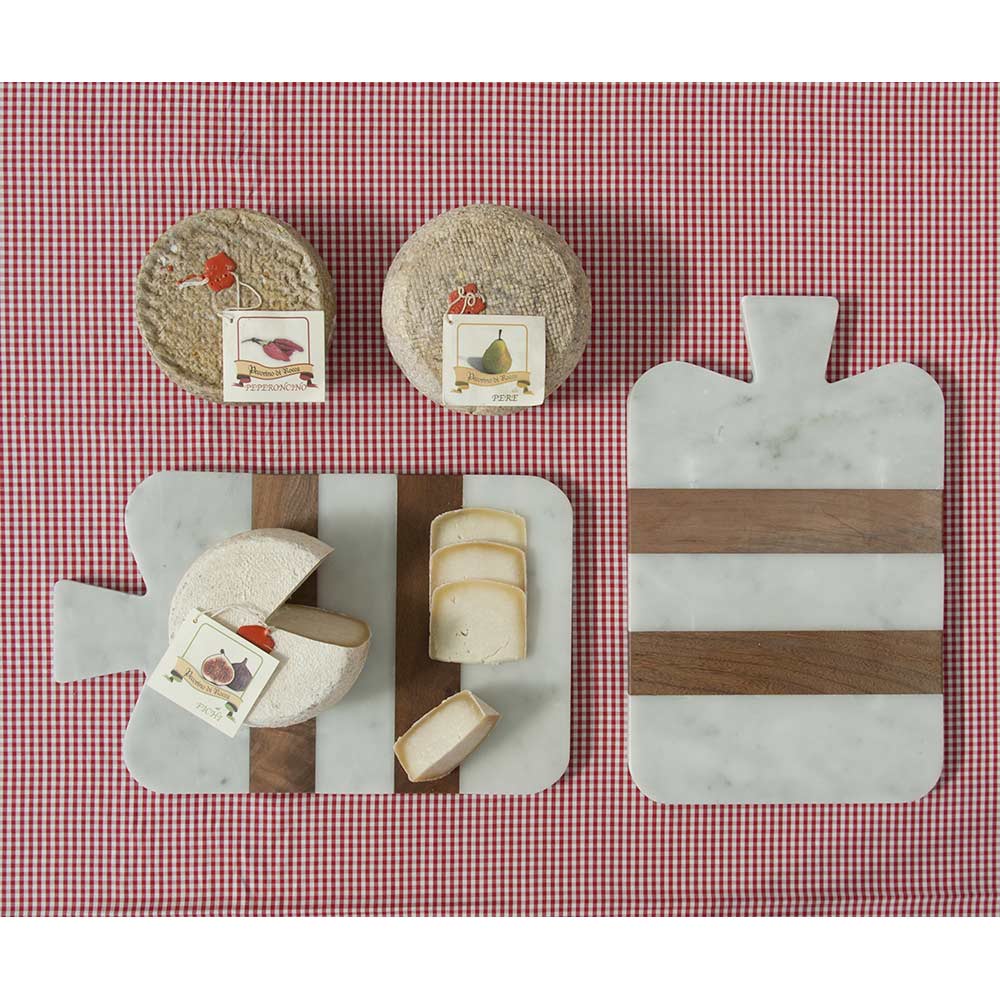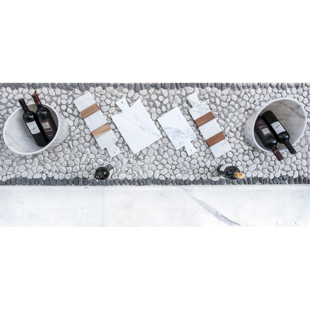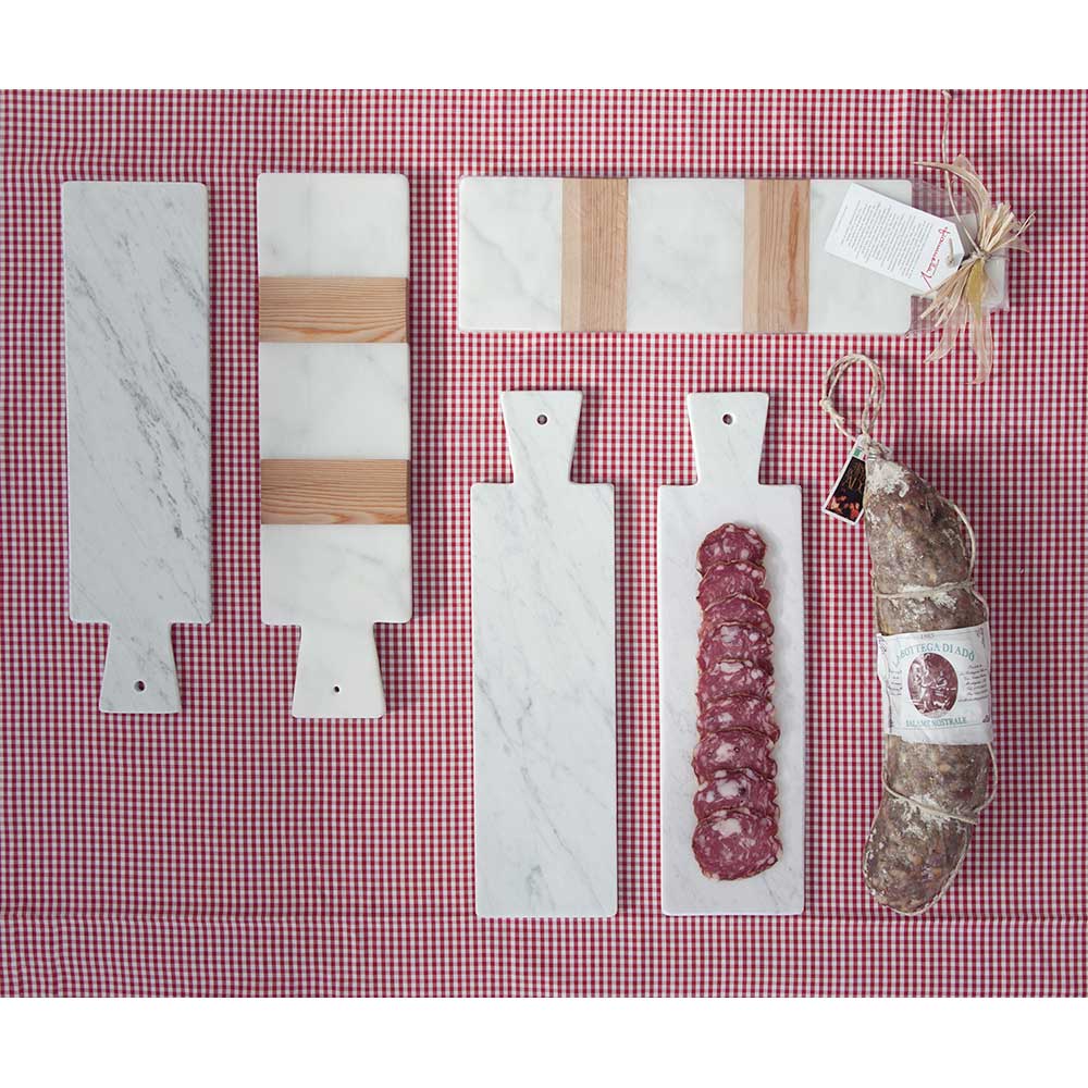 Rechteckiges Schneidebrett in 2 Größen erhältlich, gekennzeichnet durch hochwertigen weißen Carrara-Marmor verwendet für seine Realisierung und von den Holzeinsätzen . Es enthält auch ein praktisches Loch am Griff zum Aufhängen.