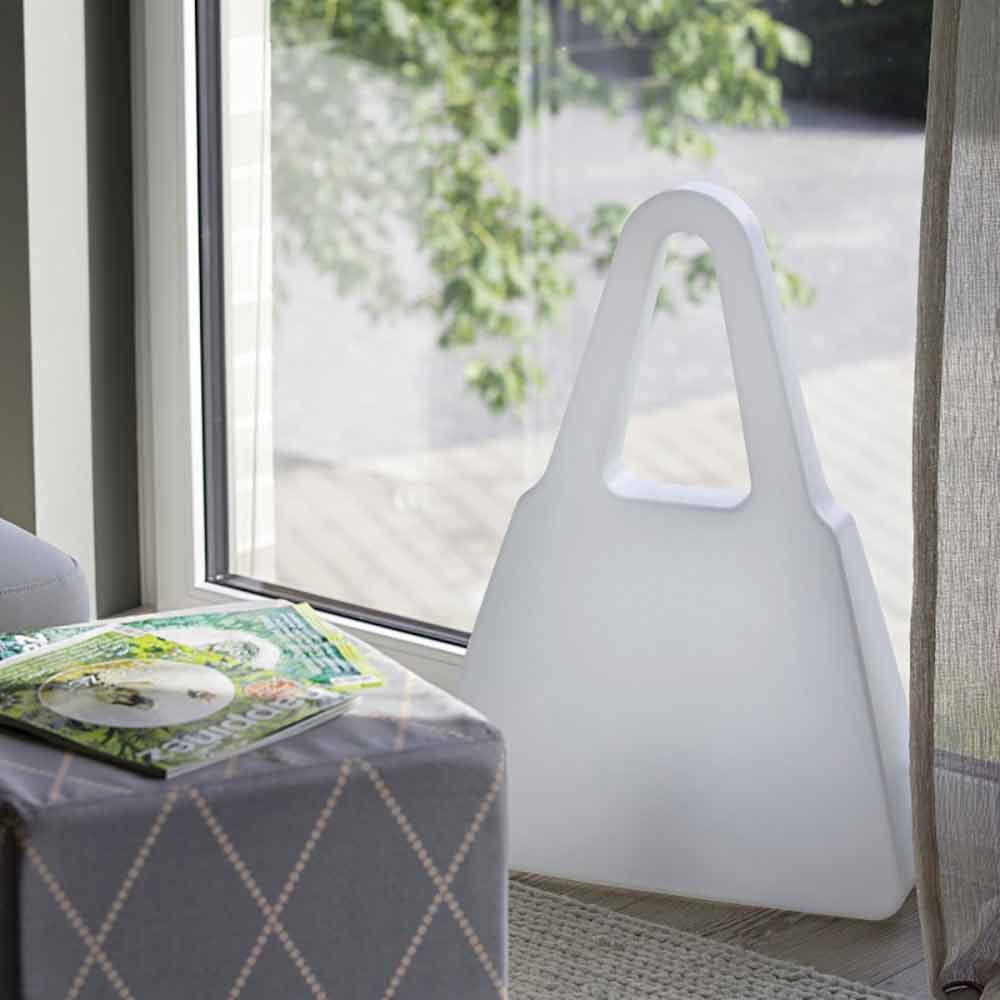 Taschenförmige Steh- oder Tischlampe, modernes Design aus Polyethylen mit LED-, Solar- oder E27-Anschluss.