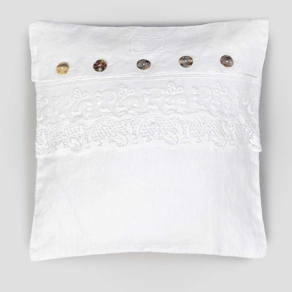 Der Wert der Tradition wird mit dem modernen Lebensstil in diesem Kissenbezug aus weißem Leinen kombiniert, der mit Tüll- oder Farnese-Spitze , Klappenverschluss und Perlmutt-Agoya-Knöpfen verziert ist.