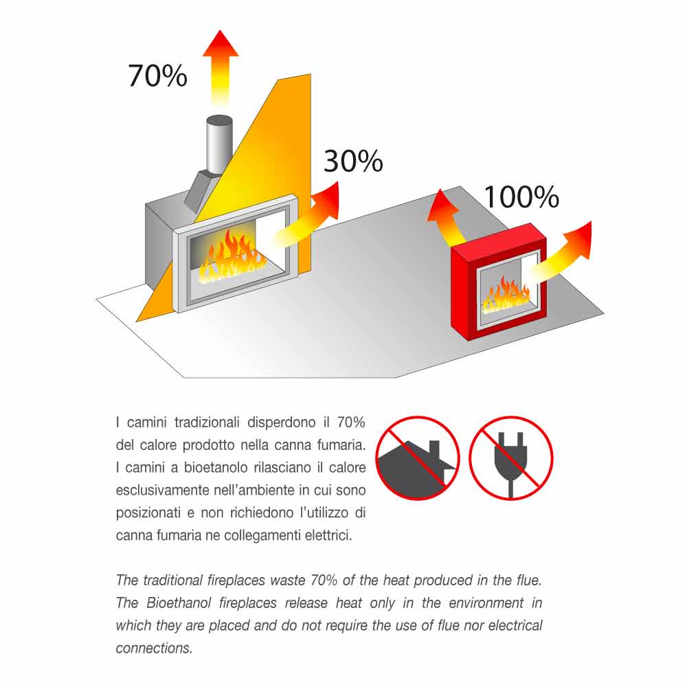 Im Gegensatz zu herkömmlichen Kaminen, bei denen 70 % der erzeugten Wärme über den Schornstein verloren gehen, gibt es bei Bioethanolkaminen, da es keinen Schornstein und keine elektrischen Anschlüsse gibt, keine Wärmeabgabe, weshalb der Wirkungsgrad 100 % beträgt.