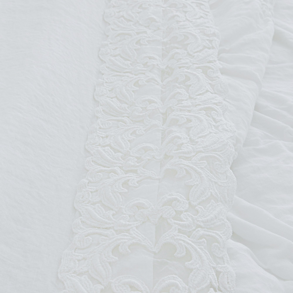 Der Wert der Tradition wird mit dem modernen Lebensstil in diesem hellweißen Leinenblatt kombiniert, das mit seitlich aufgenähten Tüll- oder Farnese- oder Häkelspitzen und gefalteten Kanten verziert ist.