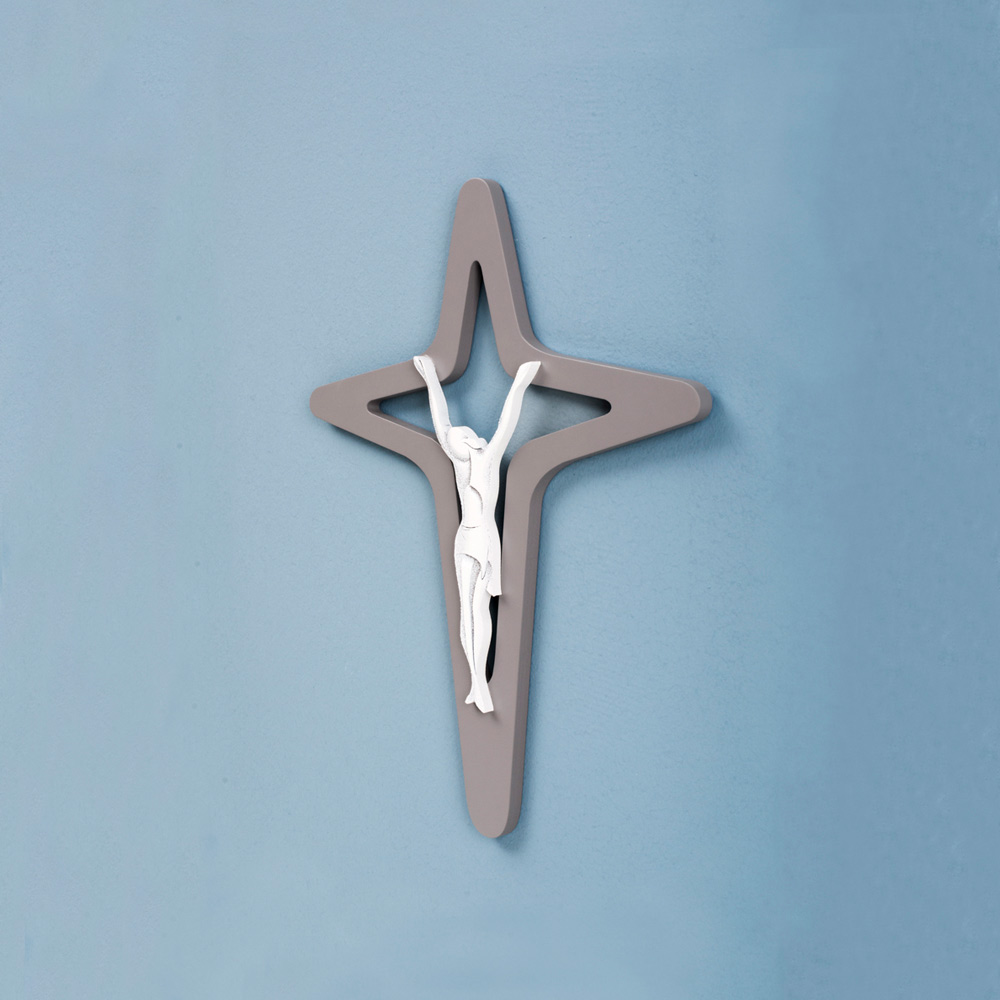 Kruzifix aus grau lackiertem Holz mit Christusapplikation aus weiß lackiertem Holz mit leichten Einschnitten , um die Merkmale des Körpers hervorzuheben .