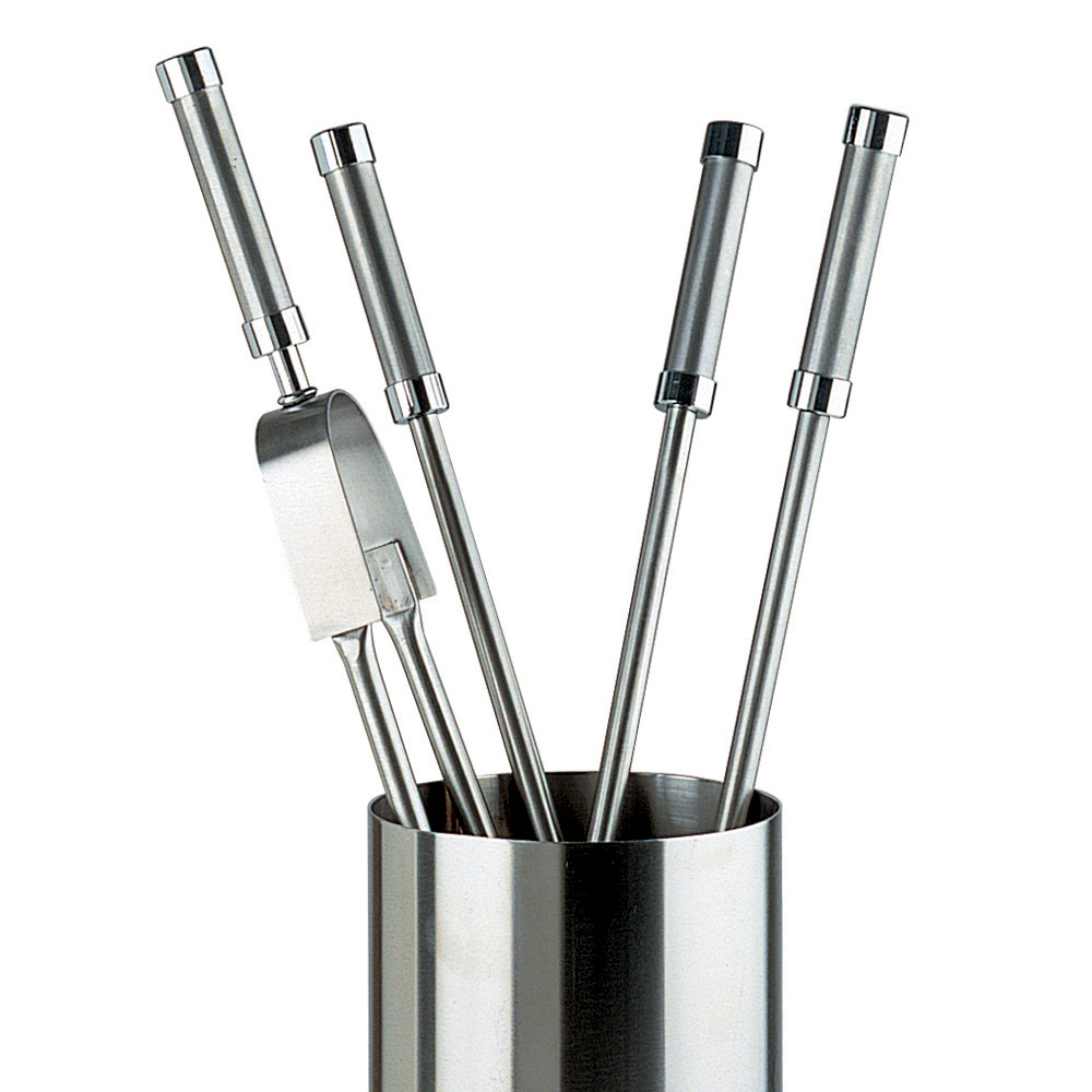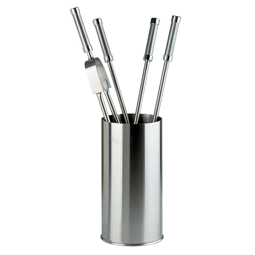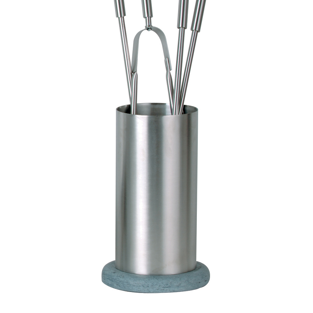 Dieser robuste und langlebige Werkzeughalter ist so konzipiert, dass er Hitze und häufigem Gebrauch standhält. Jedes Utensil ist mit einem Griff ausgestattet, der einen bequemen und sicheren Halt bietet und Ihnen den einfachen und stilvollen Umgang mit Holz und Asche ermöglicht. Die zylindrische Halterung sorgt dafür, dass jedes Werkzeug immer ordentlich und griffbereit ist, ohne auf Eleganz zu verzichten.