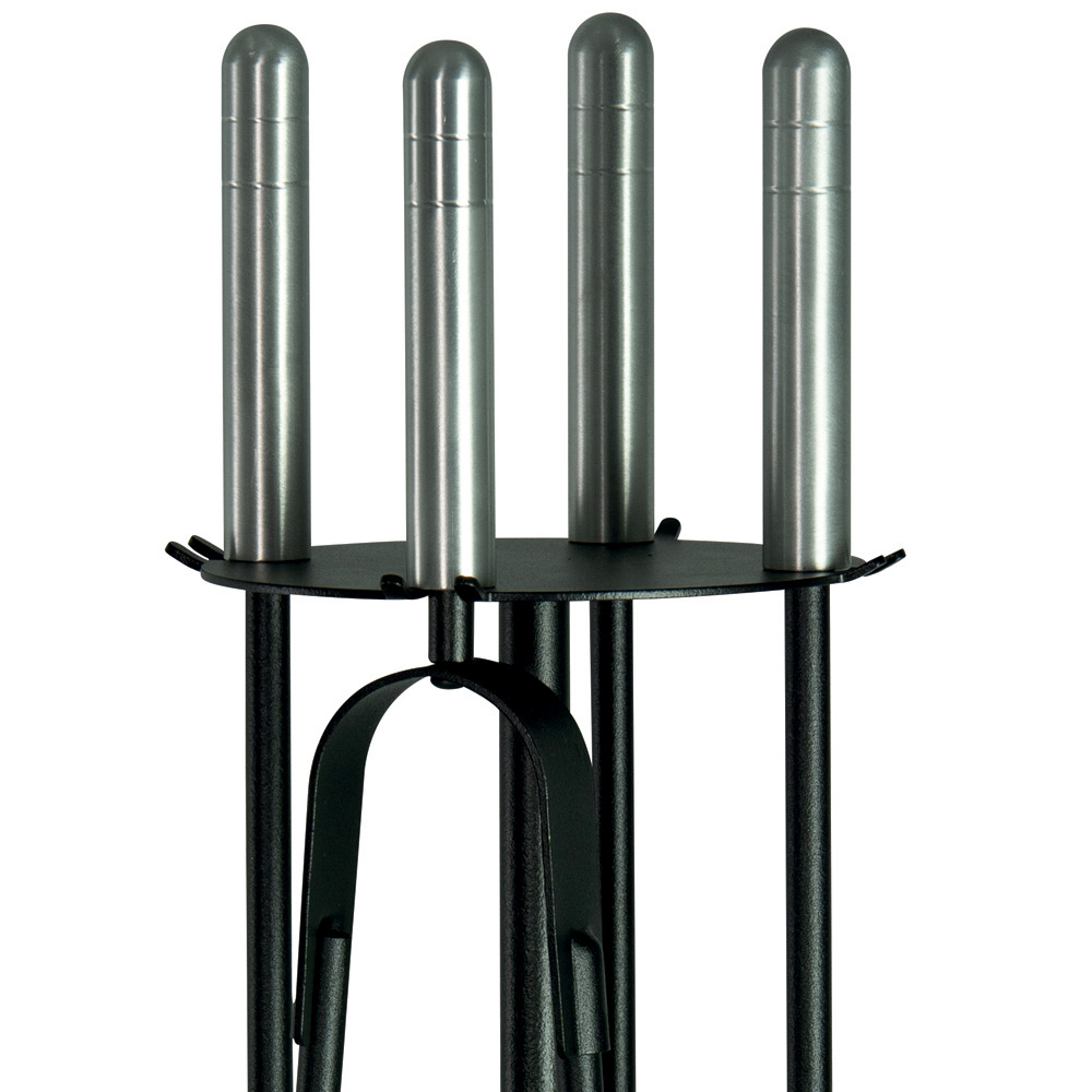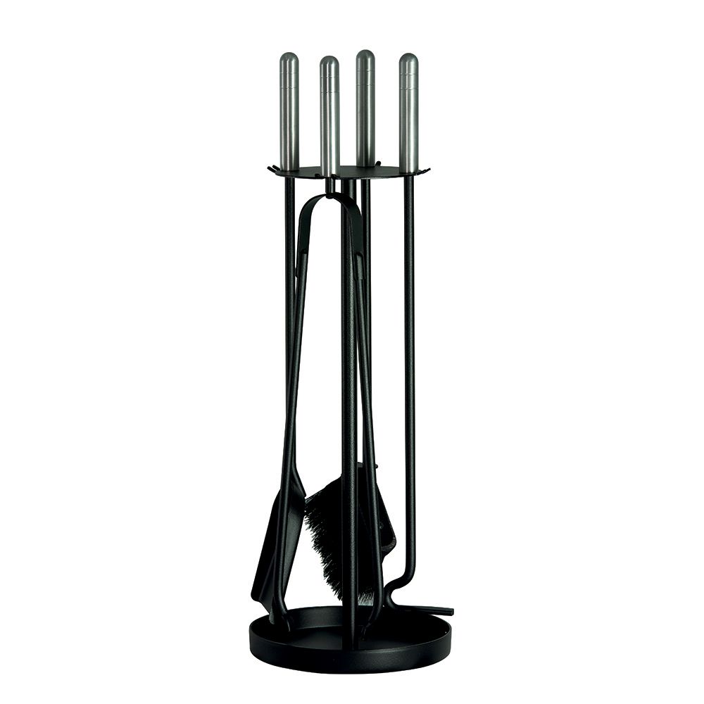 Die vertikale Halterung nimmt nicht nur wenig Platz ein, sondern organisiert das Zubehör auch effizient und sorgt dafür, dass es ordentlich und leicht zugänglich bleibt. Der runde Sockel fängt eventuelle Rückstände oder Asche auf, die bei der Verwendung der Werkzeuge herunterfallen könnten, und hält den Bereich um den Kamin herum sauber.