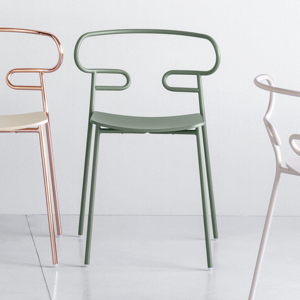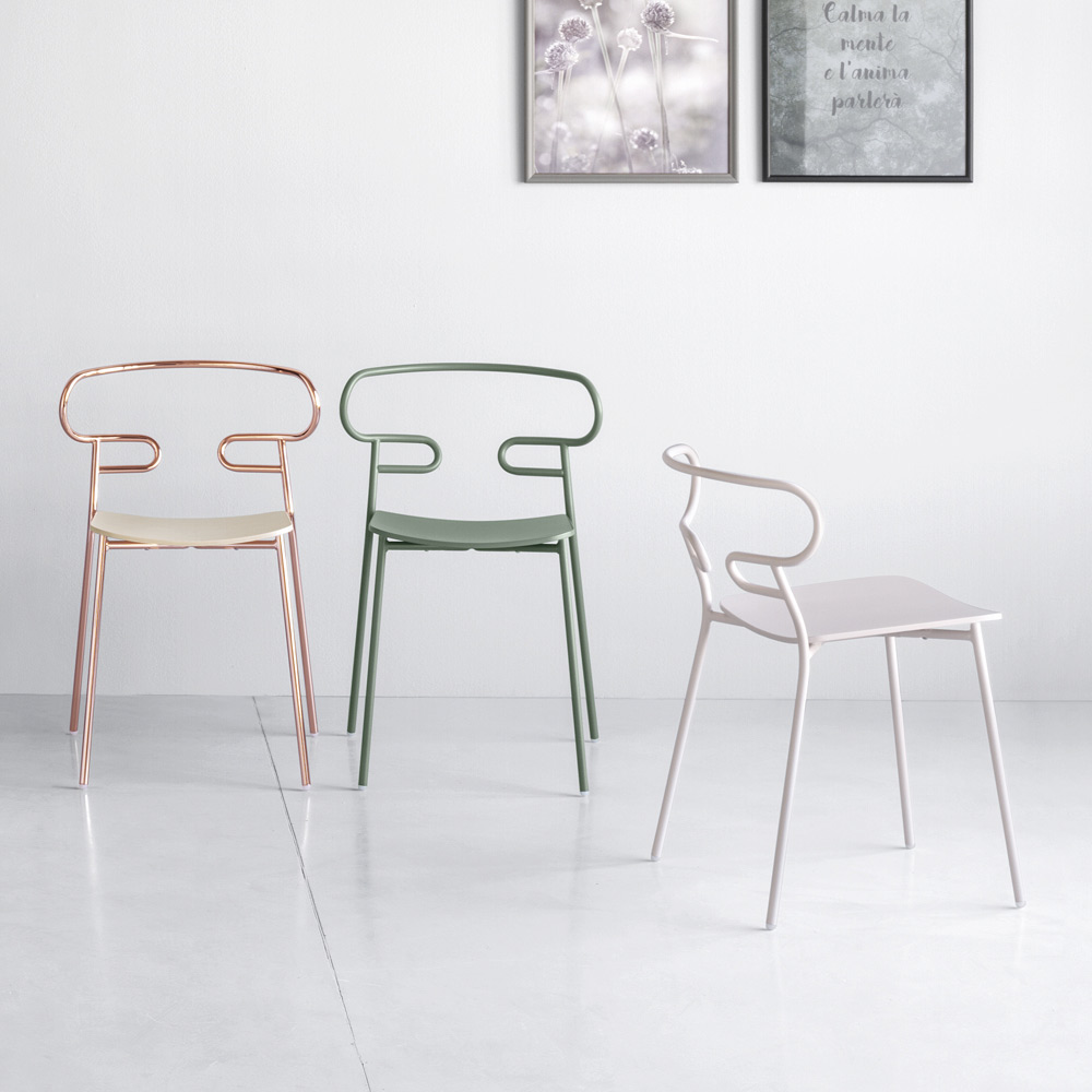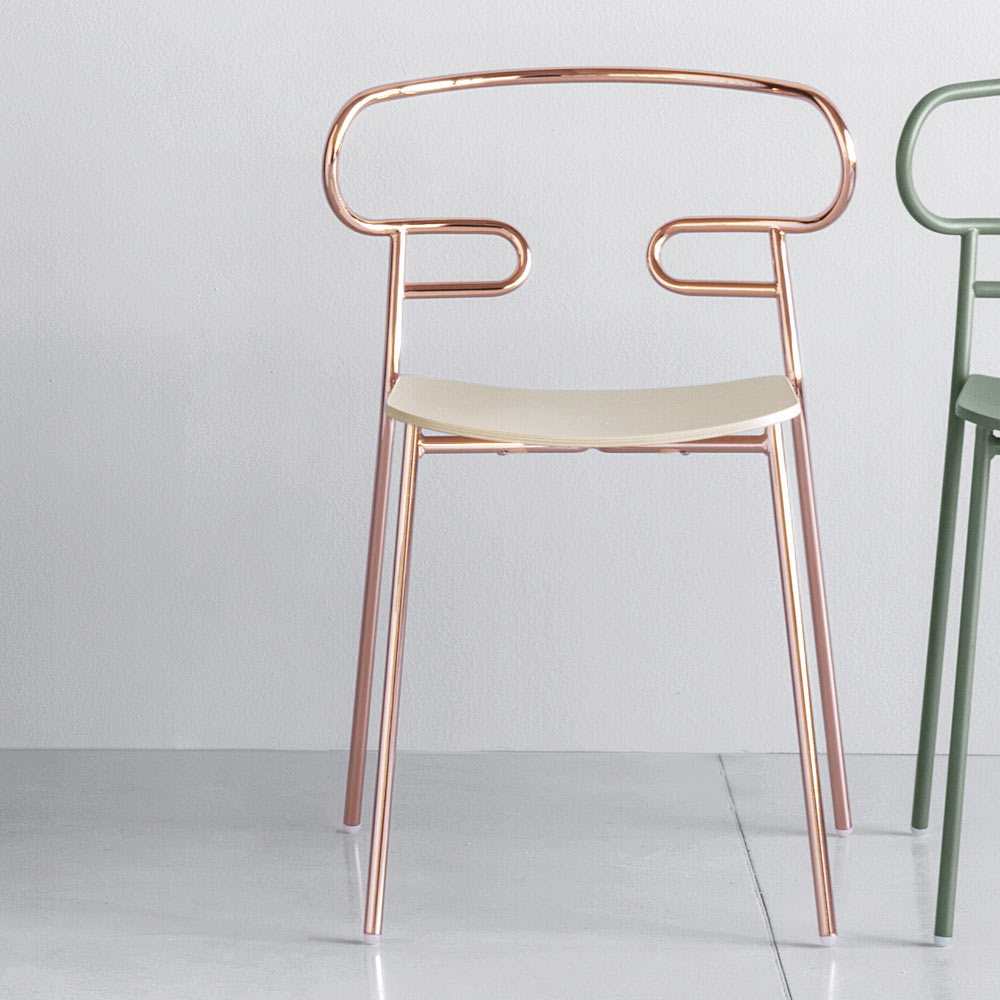 Stuhl für Esszimmer oder Küche aus lackiertem Metall mit Sitz aus Eschenholz made in Italy. Aus der perfekten Kombination von Eleganz und Einfachheit ergibt sich dieses Designobjekt mit äußerst essentiellen Linien , die ein Gefühl von Bewegung vermitteln und sich durch die Besonderheit der Rückenlehne auszeichnen, die durch die Krümmung eines einzelnen Metallrohrs erzielt wird. Dieses Merkmal erhöht seine Originalität und schafft so einen Sitz, der ebenso bequem wie ästhetisch interessant und einzigartig ist. Darüber hinaus verfügen diese Stühle dank der Möglichkeit des Stapelns über eine noch höhere Funktionalität , sodass Räume optimal optimiert und organisiert werden können.