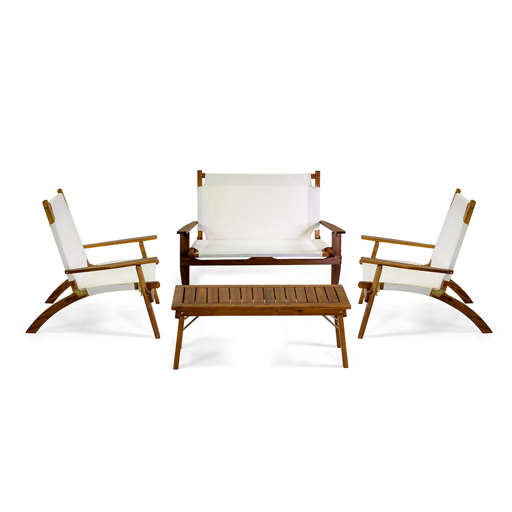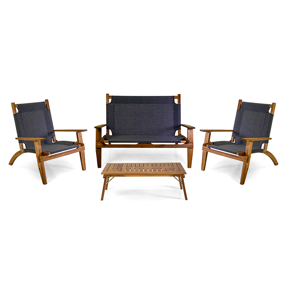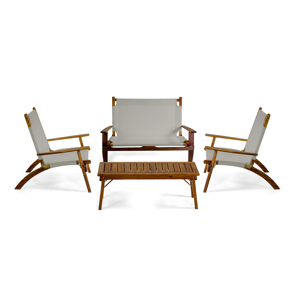 Dieses elegante hölzerne Lounge-Set ist ideal für alle, die Komfort und Stil in einem Produkt suchen. Perfekt zum Entspannen im Freien, enthält dieses Set zwei Sessel, ein Sofa und einen Kaffeetisch, alle mit einem robusten, gebogenen Holzrahmen und langlebigen Stoffdetails. Die klaren Linien und die geschickte Verwendung von Materialien machen sie zur idealen Wahl für jeden Außenbereich, vom Garten bis zur Terrasse, und bieten eine Ecke der puren Entspannung, wo man Momente der Ruhe genießen oder Freunde und Familie willkommen heißen kann. Die einladenden Sitze sorgen für maximalen Komfort und machen ihn zum perfekten Ort für jede Art von Entspannung im Freien.