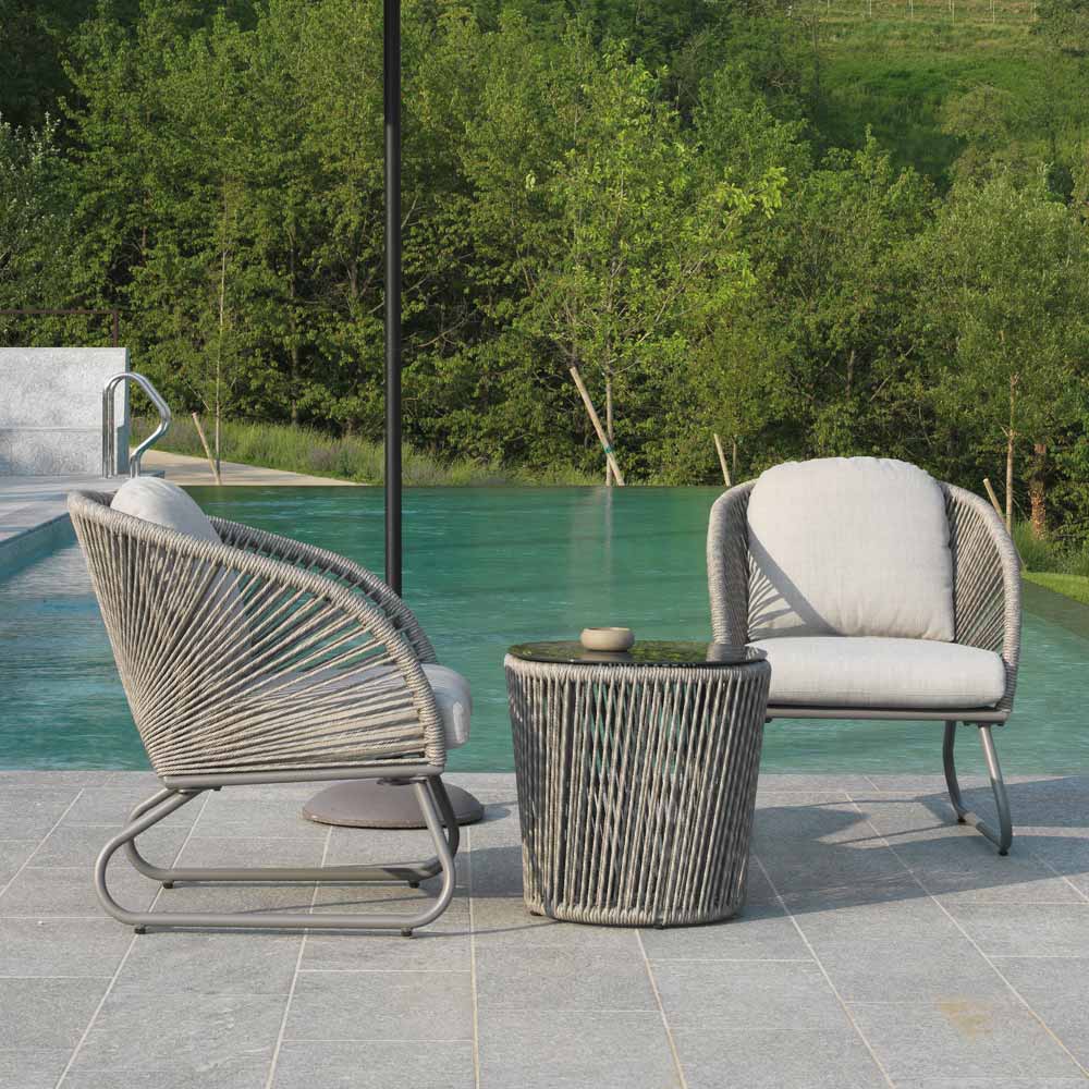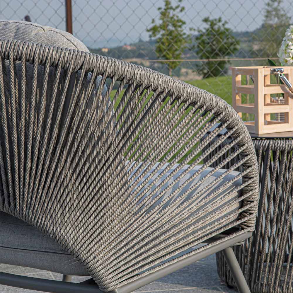 Entdecke den Charme und den Komfort unseres Wohnzimmers, eine perfekte Verschmelzung von Stil und Funktionalität für deinen Außenbereich. Die Sessel bieten mit ihren gepolsterten Kissen in Grautönen höchsten Komfort, ideal für lange Momente der Entspannung unter der Sonne oder unter den Sternen.