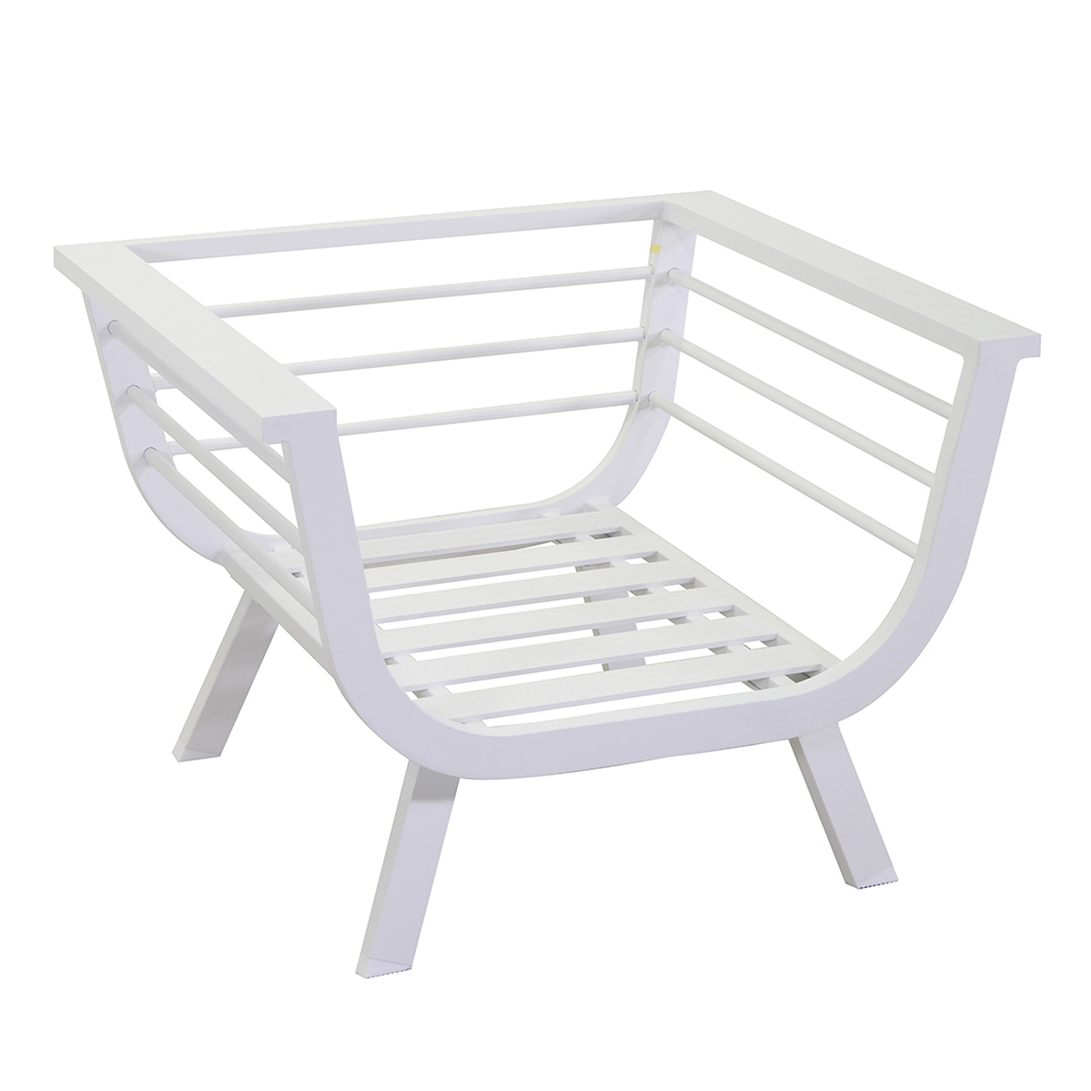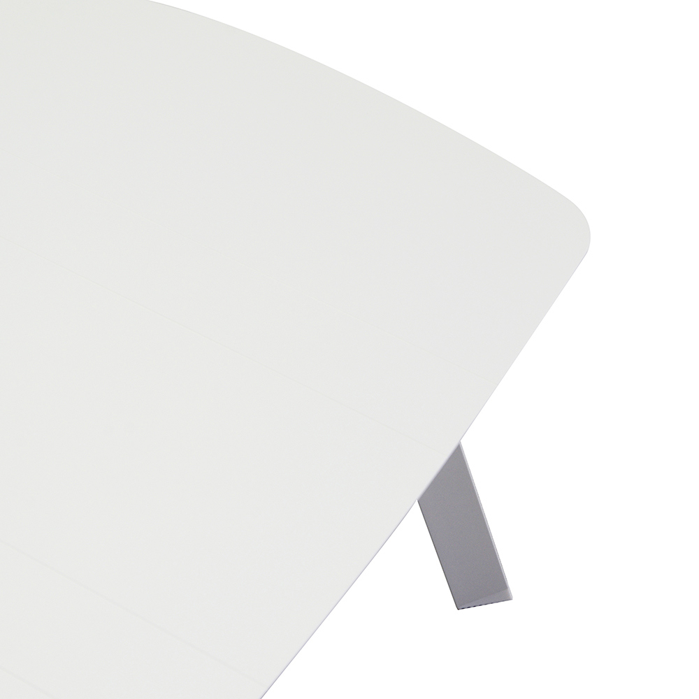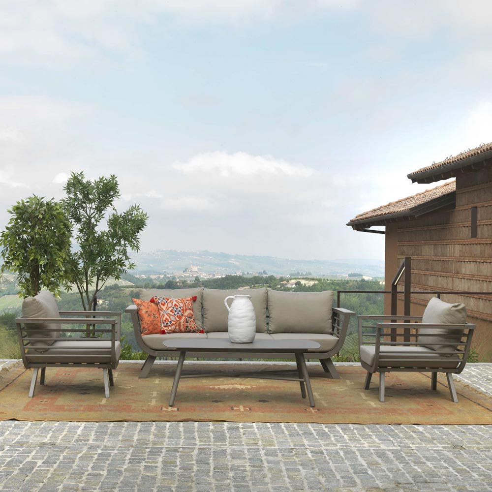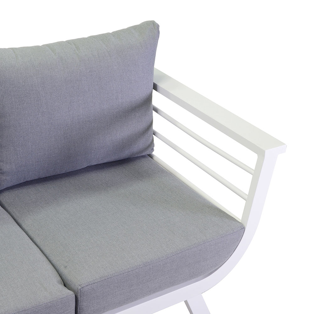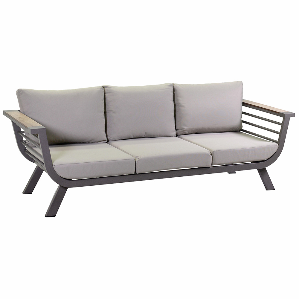 - taubengraues Aluminium, cremefarbene Kissen und HPL-Armlehneneinsätze