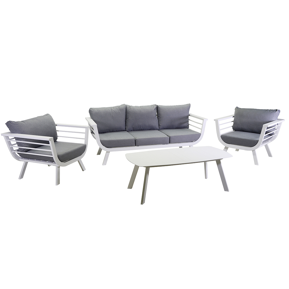 Dieses elegante Aluminium Garten Lounge Set ist die perfekte Wahl für alle, die Stil und Komfort suchen. Das Set besteht aus einem Dreisitzer-Sofa, zwei Sesseln und einem Kaffeetisch, die alle mit Kissen ausgestattet sind, die einen sehr bequemen Sitz garantieren. Perfekt für entspannende Momente in Ihrem Garten oder auf Ihrer Terrasse. Dieses Lounge-Set kombiniert durchdachtes Design und Funktionalität und schafft eine einladende und entspannende Atmosphäre.
