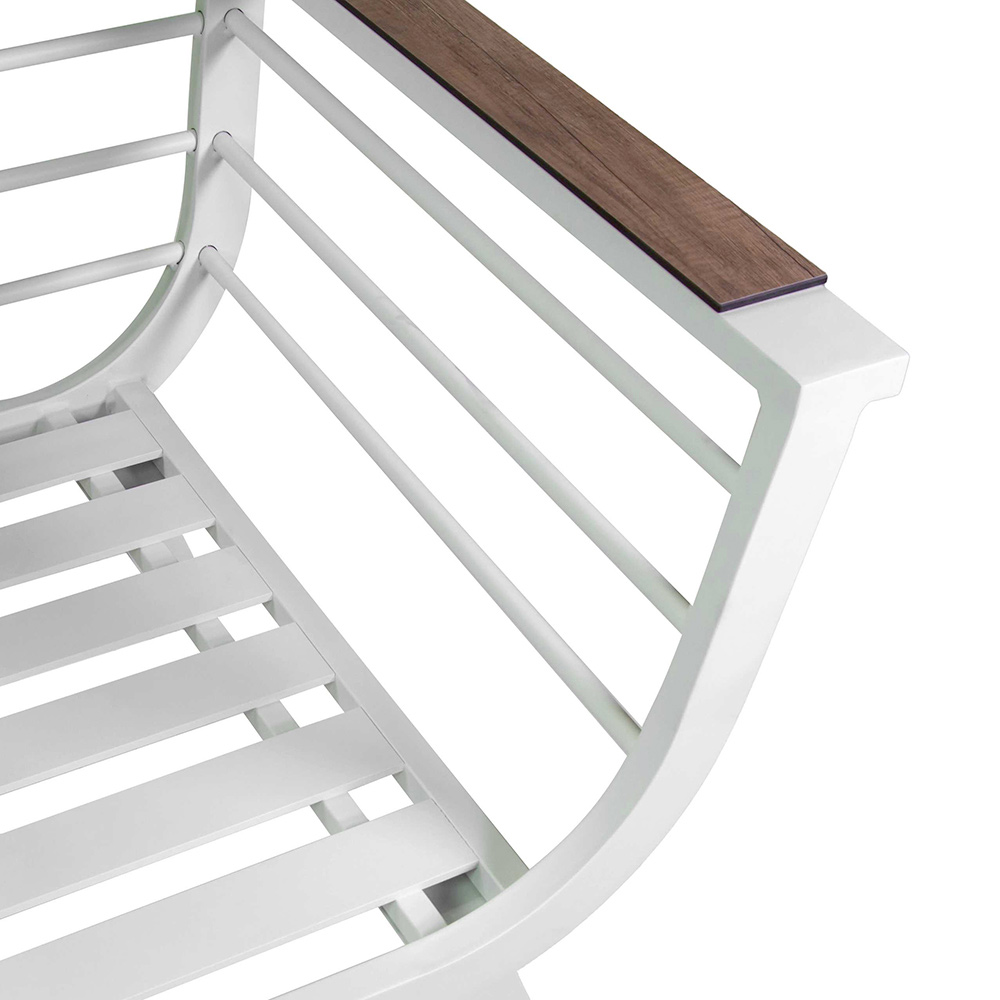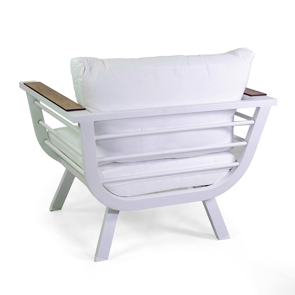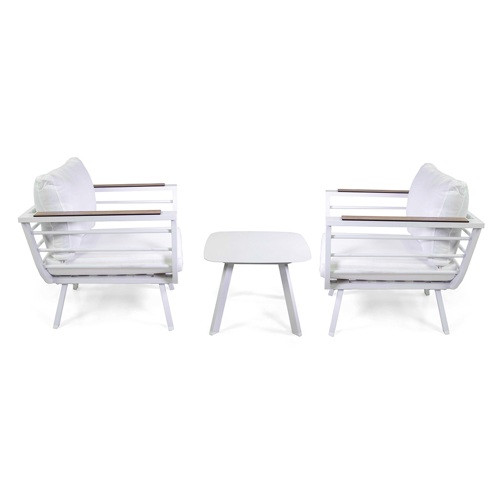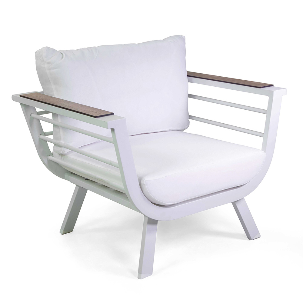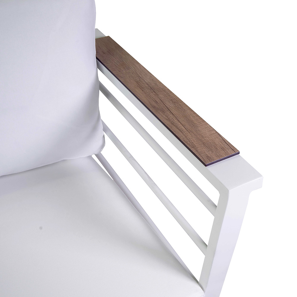 Entdecke moderne Eleganz und Komfort mit diesem weißen pulverbeschichteten Aluminium Lounge Set . Perfekt, um Ihrem Außenbereich einen Hauch von Klasse zu verleihen, enthält dieses Set zwei Sessel mit 12 cm dicken abnehmbaren Kissen aus 100% wasserabweisendem Olifen-Stoff, die Komfort und Langlebigkeit garantieren. Die HPL-Armlehneneinsätze verleihen einen Hauch von Stil und Zweckmäßigkeit, während der weiße Aluminiumtisch robust und pflegeleicht ist.