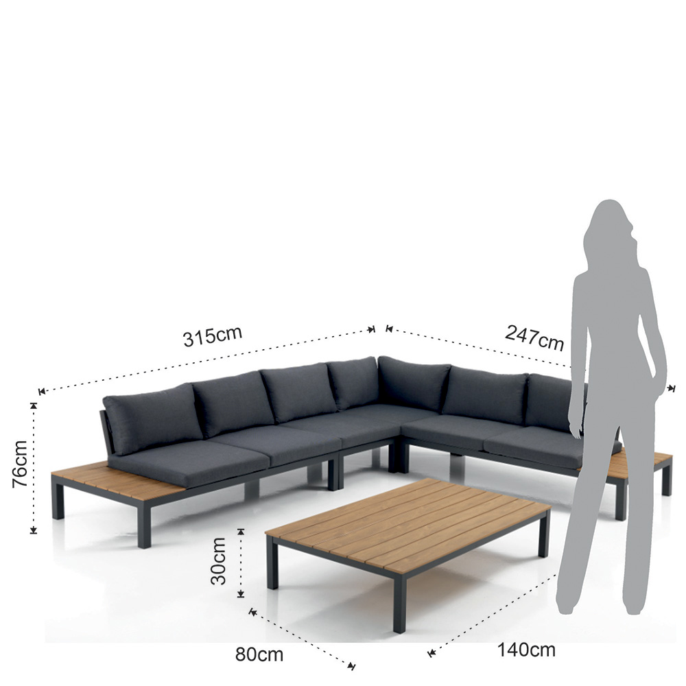 Außen- und Innensofa mit mattanthrazitfarbener, pulverbeschichteter Aluminiumstruktur , Kissen mit grauem Polyesterbezug und abnehmbaren Bezügen, Regalen aus Polyholz mit Eichenholzoberfläche und verstellbarem Fuß. Die Struktur besteht aus 1 Ecksofaelement, 3 Sitzen rechts/links + 2 Sitzen rechts/links, Anordnung nach Wahl bei der Montage