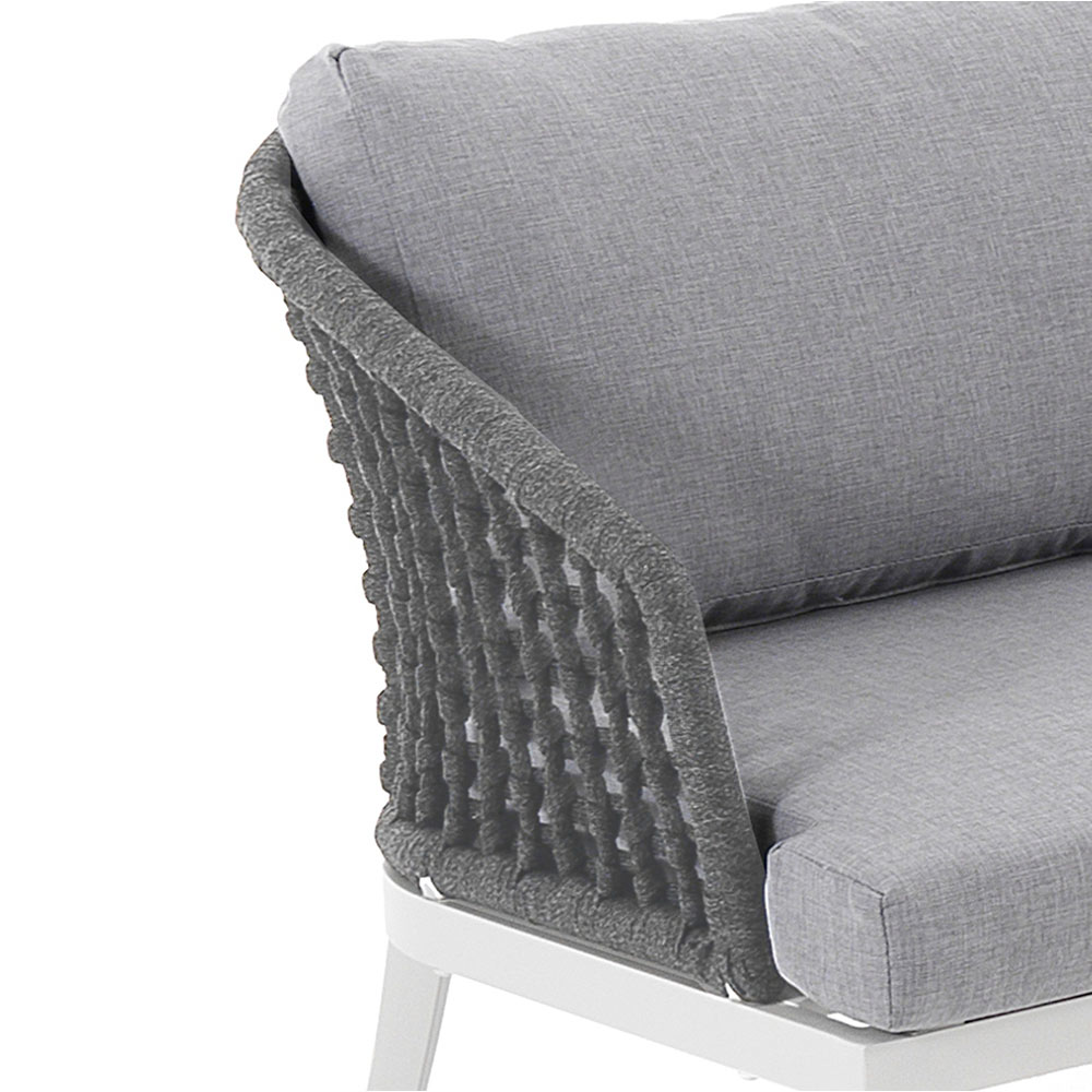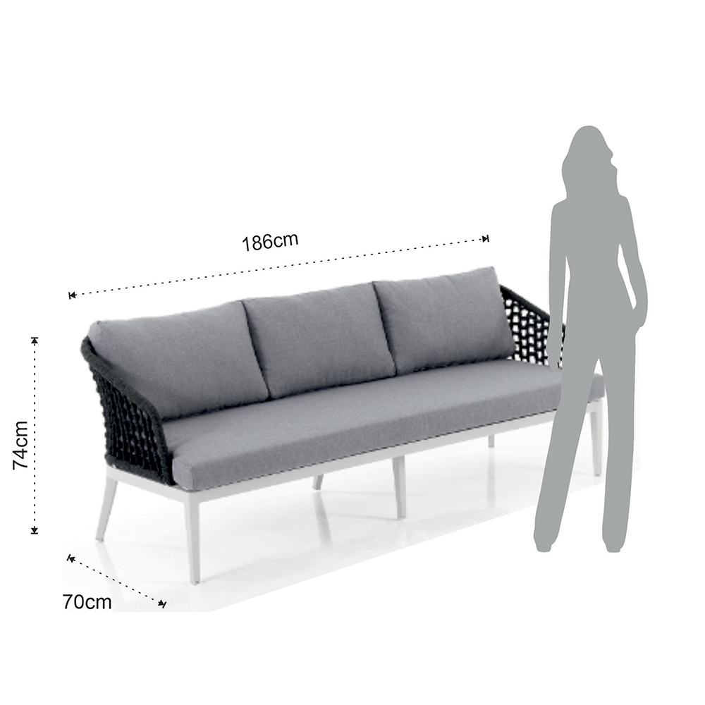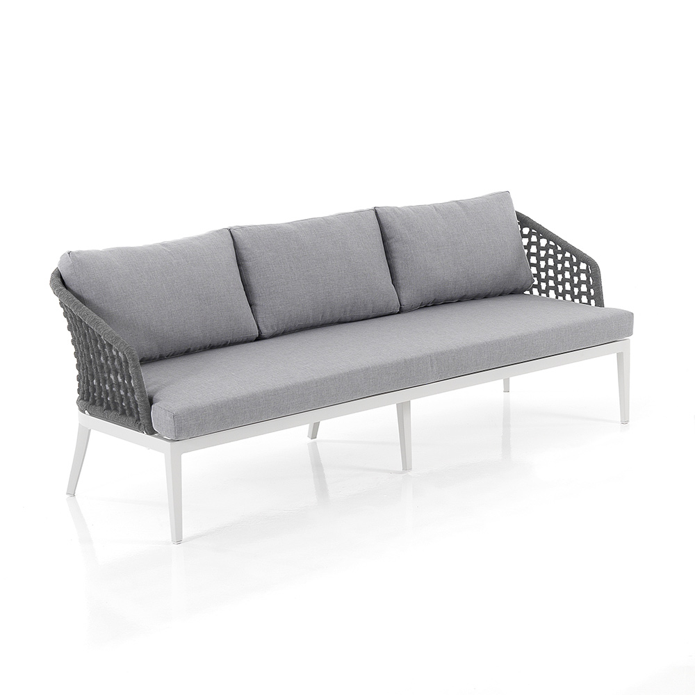 Außen- und Innensofa mit mattweißer Aluminiumstruktur , abnehmbaren Kissen mit hellgrauem 310-g- Polyesterbezug , Innenpolsterung aus Schaumstoff (Sitzhöhe 9 cm) und Rückenlehnenbezug aus dunkelgrauem Polypropylenfasergewebe .