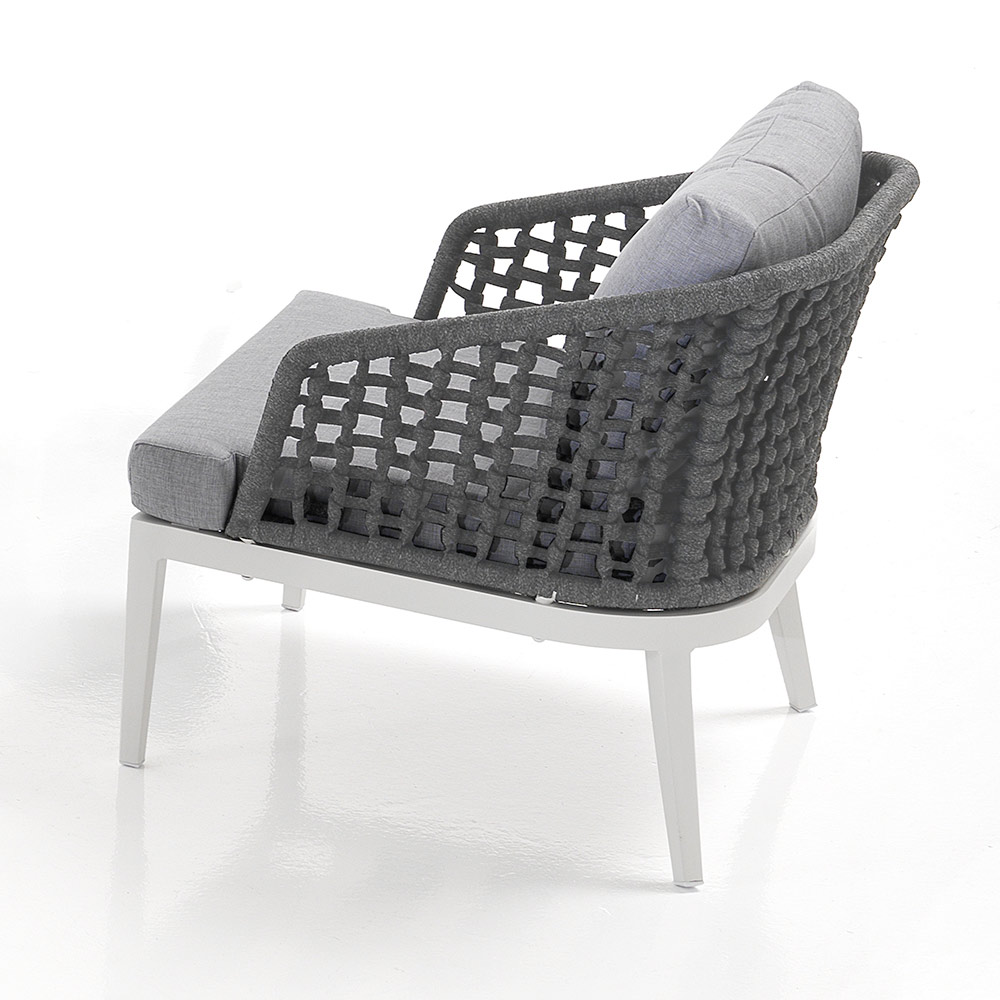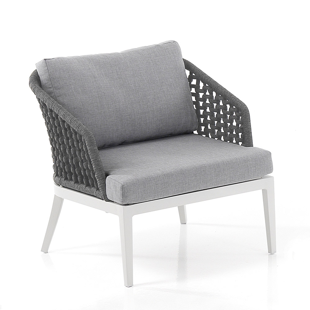 Beinhaltet 2 Sessel mit mattweißer Aluminiumstruktur , abnehmbaren Kissen mit hellgrauem 310-g- Polyesterbezug und interner Schaumstoffpolsterung (Sitzhöhe: 9 cm). und Rückenlehnenbezug aus dunkelgrauem Polypropylenfasergewebe .