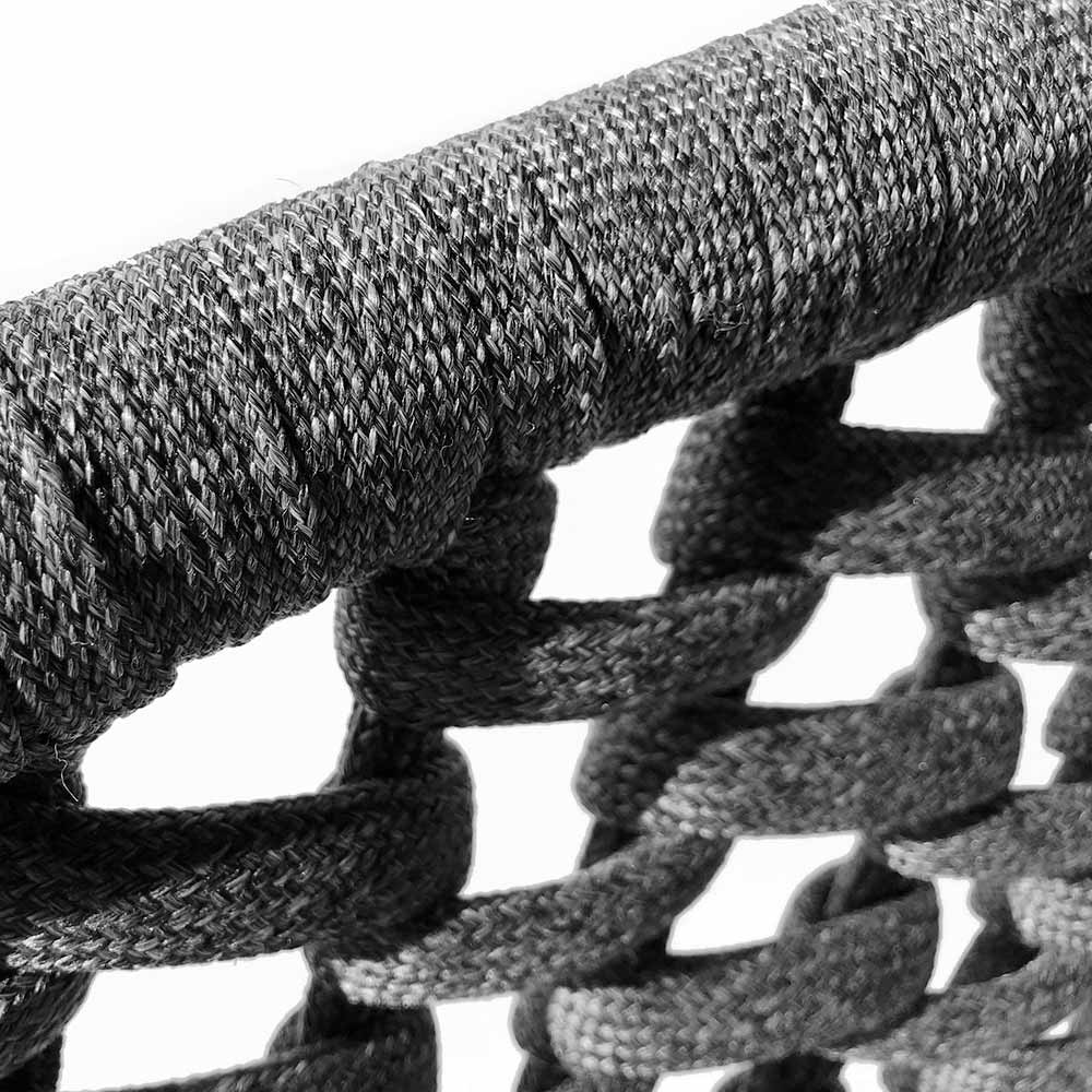 Die hellgrauen Kissen bieten gemütlichen Komfort und einen angenehmen Kontrast zur dunklen Struktur, der zum Entspannen und Gespräch einlädt. Der passende Couchtisch ist ideal für abendliche Cocktails oder Frühstücke im Freien und dient als zentraler Punkt für Unterhaltung und Entspannung.