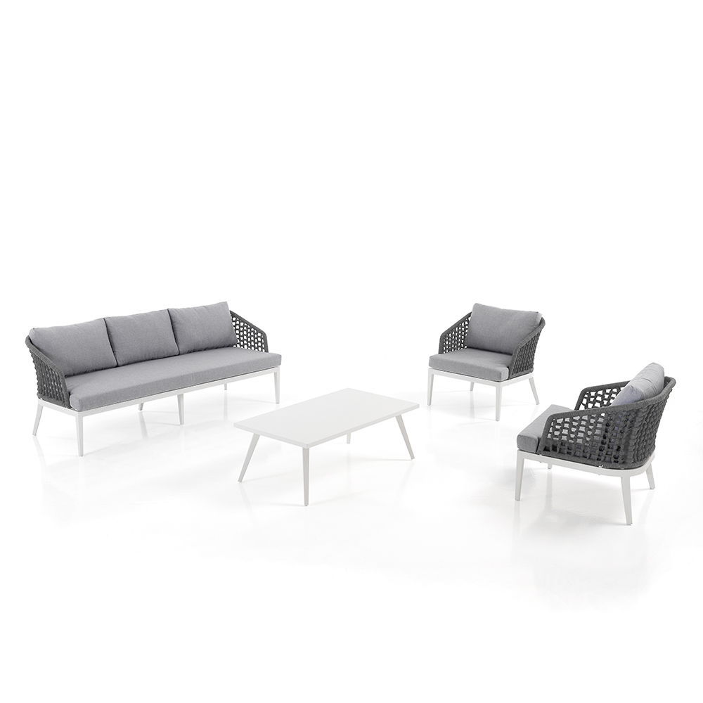 Diese Lounge mit Couchtisch für den Garten ist ein Beispiel für raffiniertes Design und Komfort . Die Kombination der Sessel und des Sofas mit ihrem Geflecht auf einer Aluminiumstruktur sorgt für ein elegantes und modernes Aussehen, perfekt, um jedem Außenbereich einen Hauch von Klasse zu verleihen.