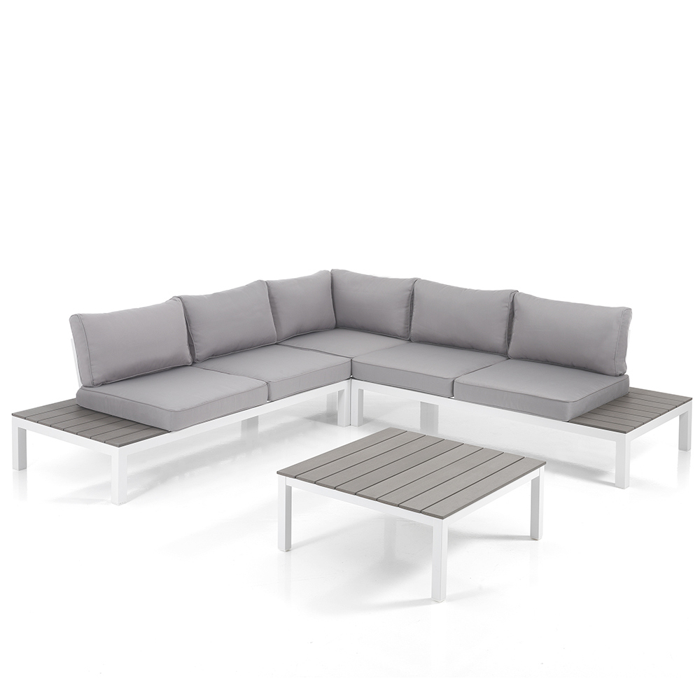 Dieses Ecksofa und Gartentisch verkörpern die Quintessenz eleganter Entspannung und zeitgenössischen Stils. Mit seinem weißen Rahmen und den klaren Linien bietet das Sofa einen schicken, modernen Kontrast zum warmen Holz der Sitz- und Tischoberfläche und schafft eine einladende Umgebung, die sowohl einladend als auch ästhetisch ansprechend ist.