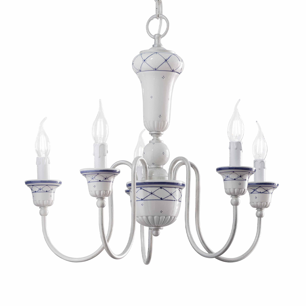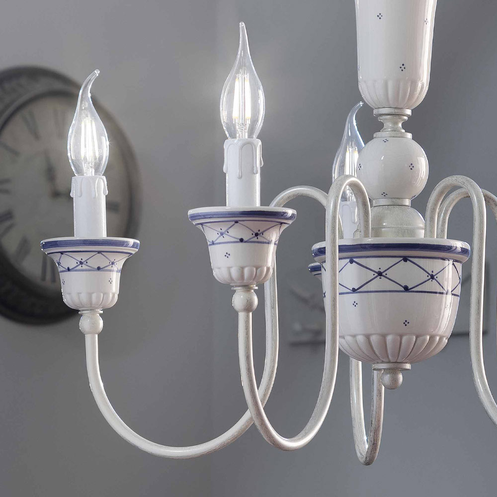 Handgefertigter 5-flammiger Kronleuchter aus Messing und handbemalter Keramik, hergestellt in Italien von Ferroluce.