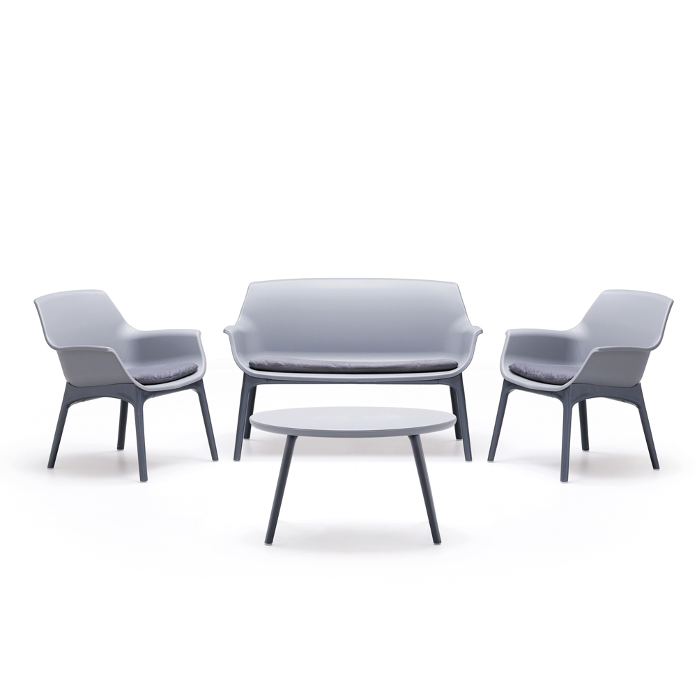 Sofa und Sessel mit Struktur aus anthrazitfarbenem/grauem Polypropylen und Sitz mit Kissen aus grauem Stoff . Couchtisch komplett aus anthrazitfarbenem/grauem Polypropylen.