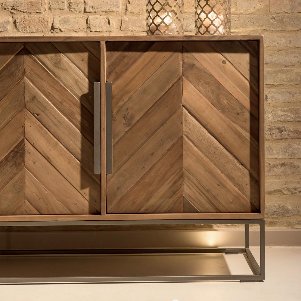 Sideboard für den Innenbereich aus recyceltem Holz in natürlicher Kaffeefarbe mit 4 Vordertüren im Fischgrätmuster und Metallfüßen .