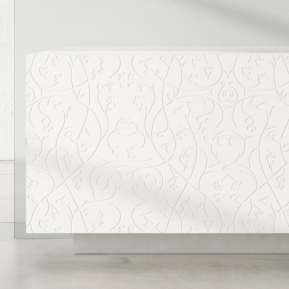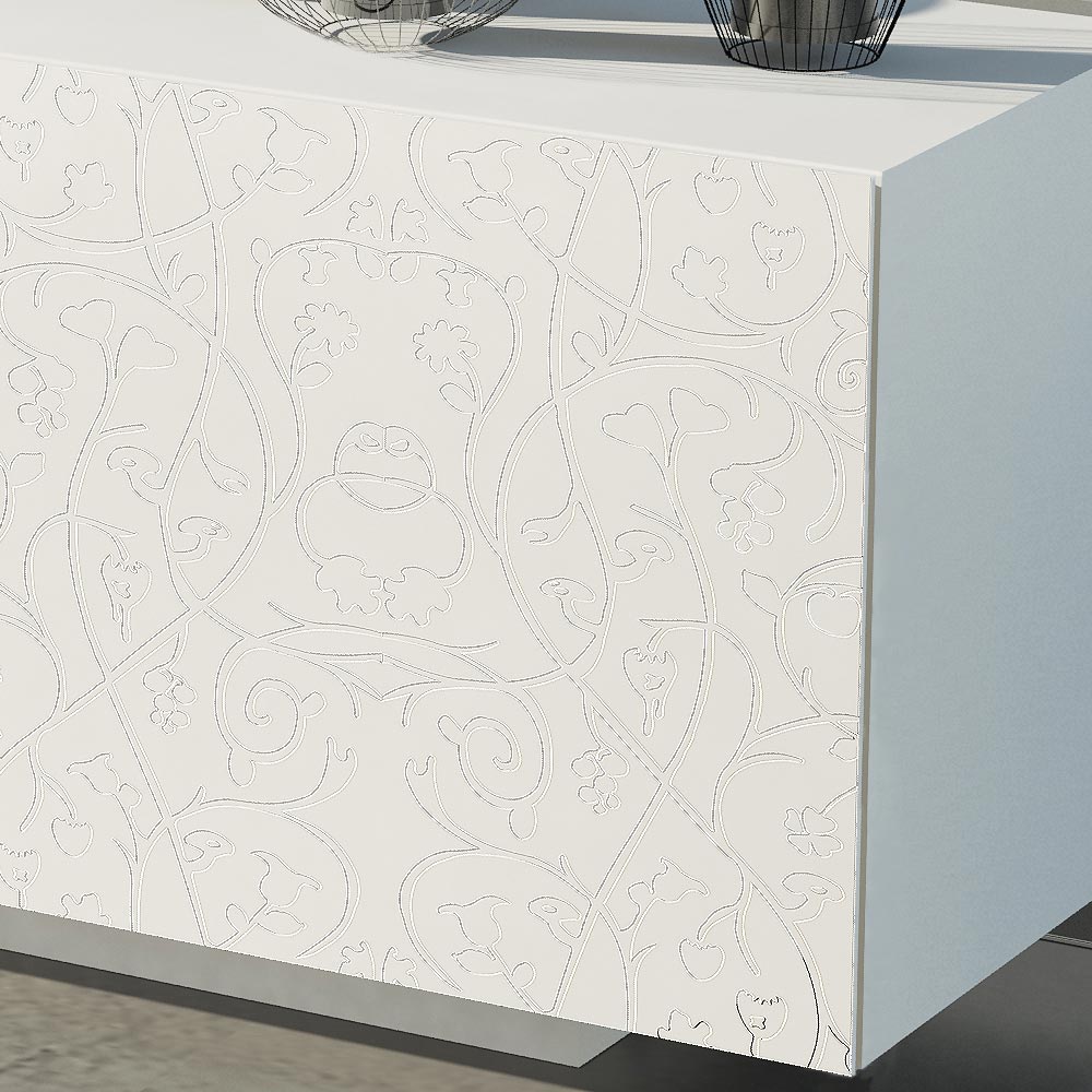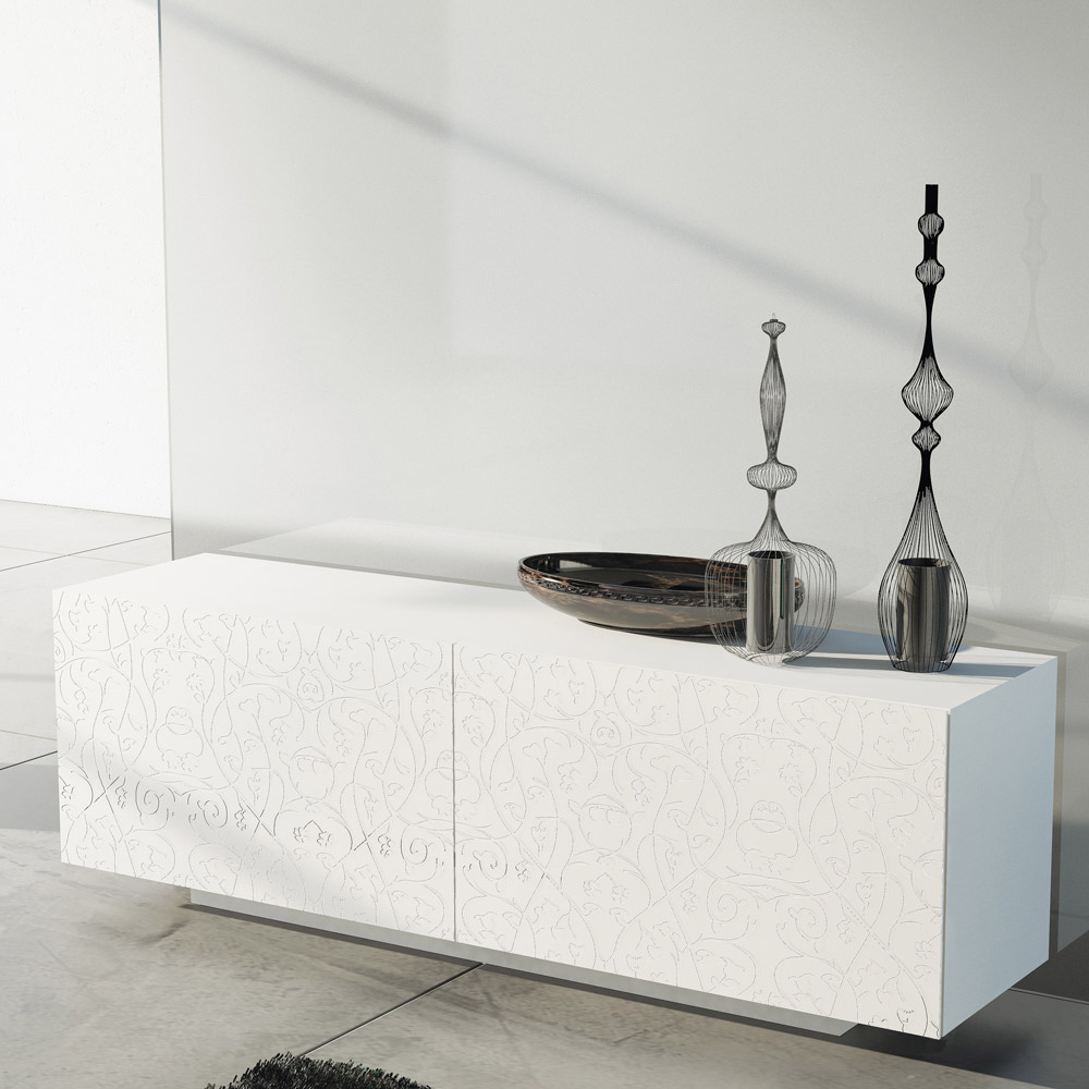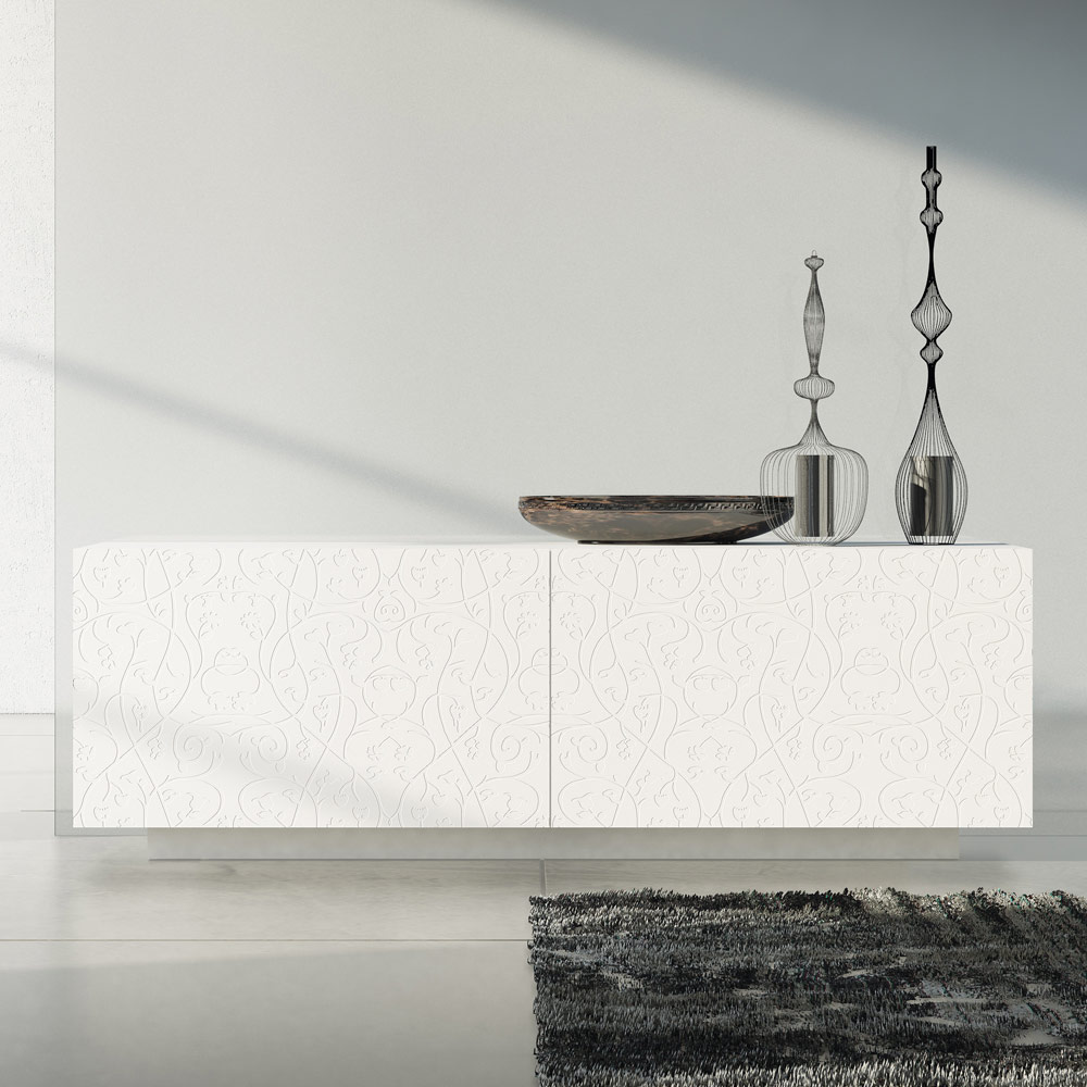 Modernes Sideboard mit weiß matt lackierter MDF- Struktur, bestehend aus 2 koplanaren Schiebetüren die hohe Funktionalität und Praktikabilität garantieren und vom lackierten Sockel , der viel Stabilität bietet. Dieses Produkt ist voller Geschmack und Design dank seiner eleganten und raffinierten Oberflächen und der Basrelief-Dekoration der Türen, die sie in ihrer Art einzigartig machen. Die verschiedenen Materialien, die für die Konstruktion verwendet werden, bieten eine hohe Qualität und Beständigkeit im Laufe der Zeit und verleihen dem Produkt eine einzigartige und unvergessliche Note.